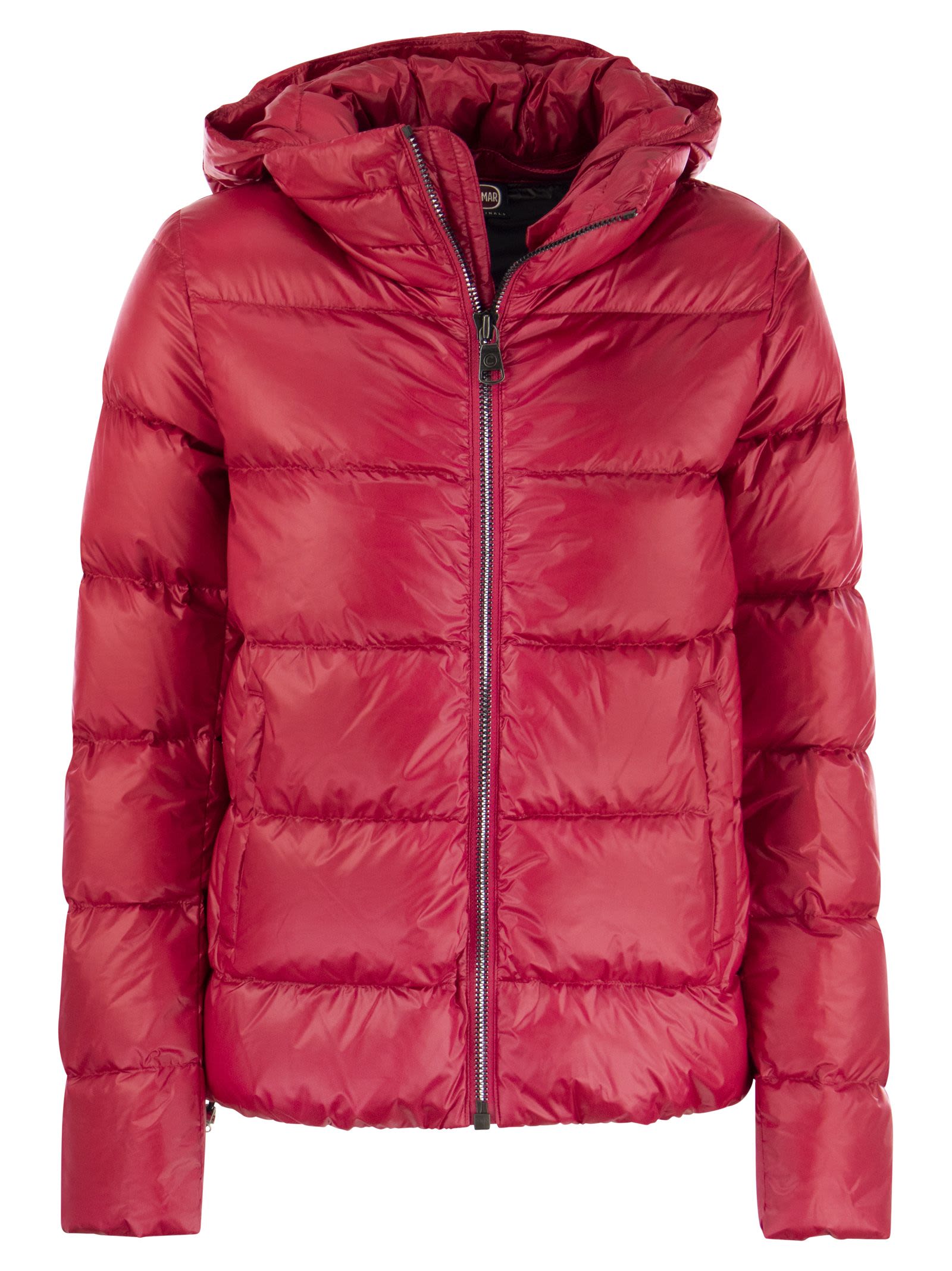 Women's jacket with detachable hood made of recycled fabric with iridescent effect and water-repellent treatment. Filled with natural down. Warmth and comfort are ensured by the large collar with thicker quilting and the wrap-around hood tied to the collar by a zip. A practical adjustment drawstring allows you to vary the width of the hem. Ready to face the cold winter days? - Regular fit - Winter weight - Zipped closure - Zipped side pockets - Detachable zipped hood - Adjustable drawstring at hem - Natural down filling - Water-repellent treatment - Recycled fabric - Colmar Originals logo applied on left sleeve DESIGNER ID: 2216 5WG 613