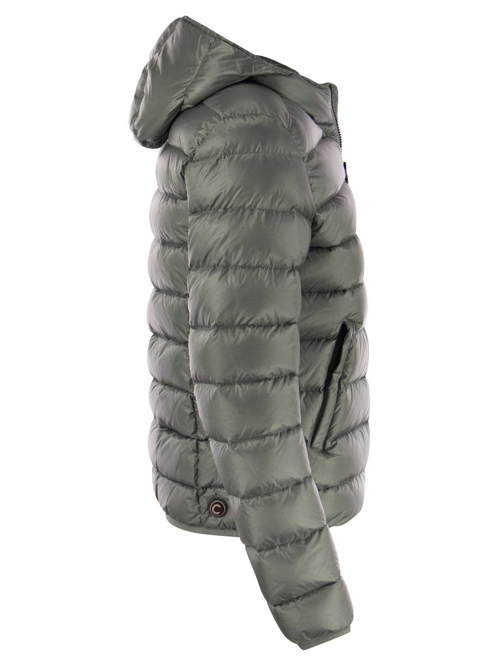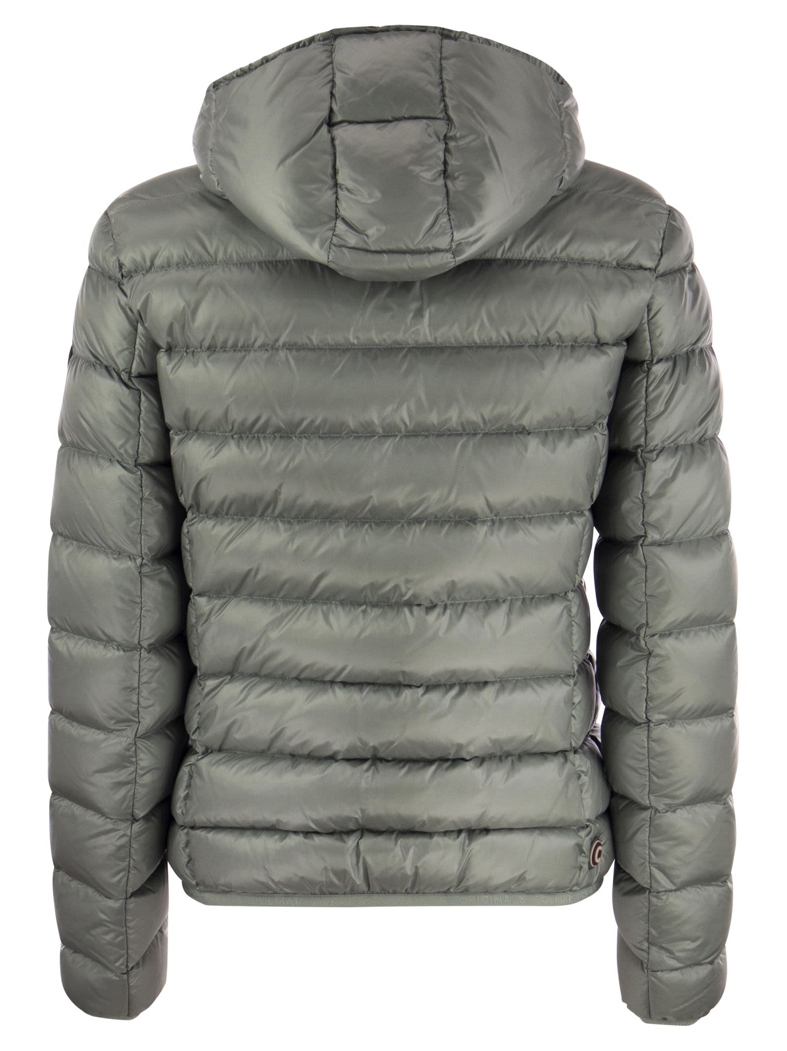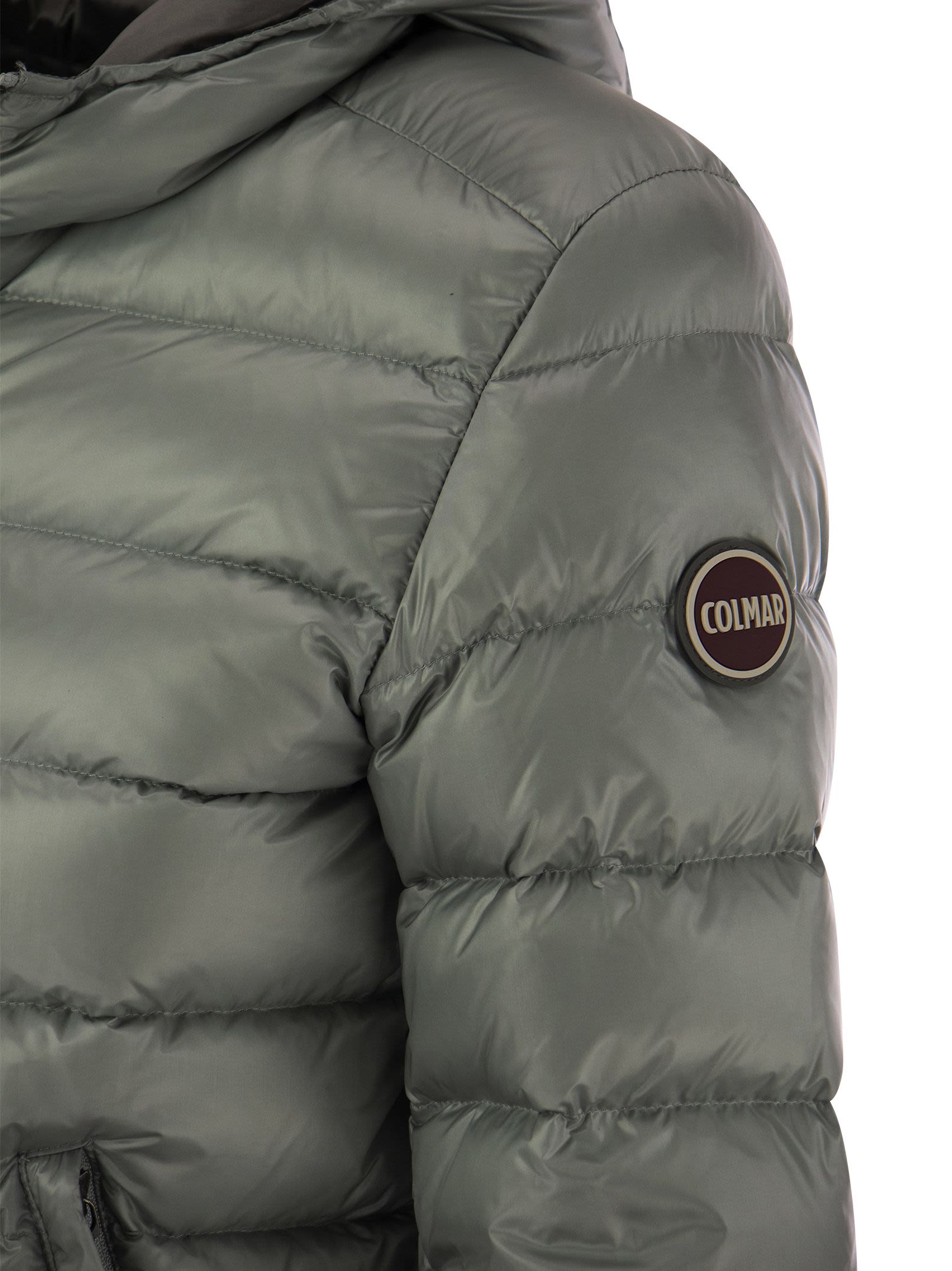 Women's jacket with fixed hood, made of recycled fabric, water-repellent and padded with natural down. The right decoding of the sporty garment par excellence brought to a decidedly more fashionable level. The contrasting lining, the iridescent effect of the fabric and the slight shaping of the hips give a nod to a trendy look. A classic example of the Colmar Originals style. - Zip closure - Side zipped pockets - Fixed hood - Elastic ribbon at hem and cuffs - Contrasting lining - Water-repellent treatment - Colmar Originals logo applied on the left sleeve DESIGNER ID: 2286N 5WG 609