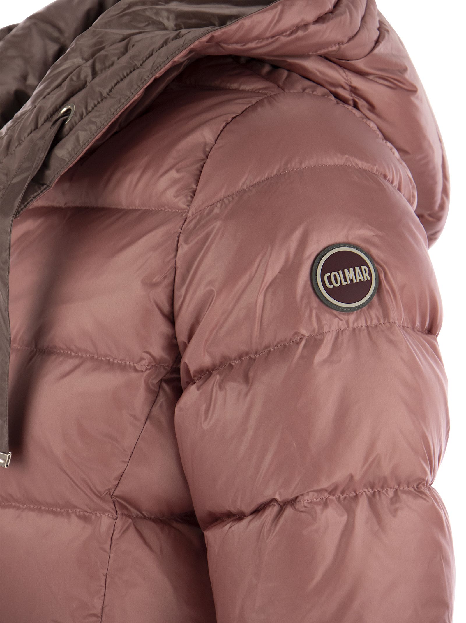 Down jacket with fixed hood, made of water-repellent, iridescent fabric and padded with natural down. Wrap-around hood, regular quilting and a slight waistline to emphasise the silhouette for a truly feminine winter look. - Two-way zip closure - Side pockets with invisible zips - Fixed hood - Natural down filling - Water repellent treatment - Reversible - Colmar Originals logo applied on the left sleeve DESIGNER ID: 2225 5WG 327