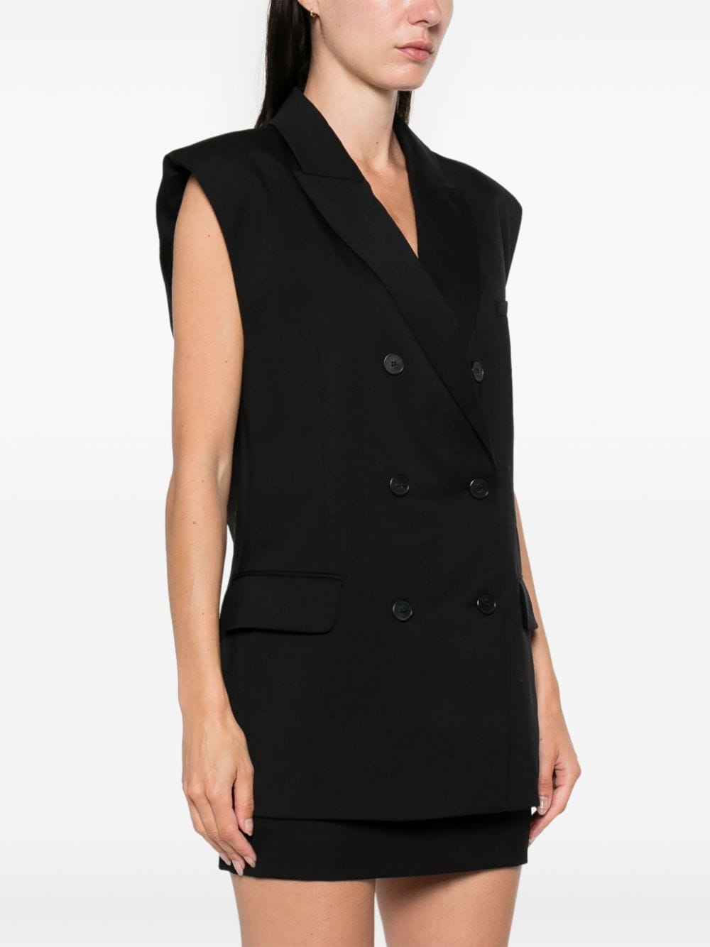 black wool blend twill weave double-breasted button fastening V-neck peak lapels sleeveless chest welt pocket two side flap pockets central rear vent full lining straight hem