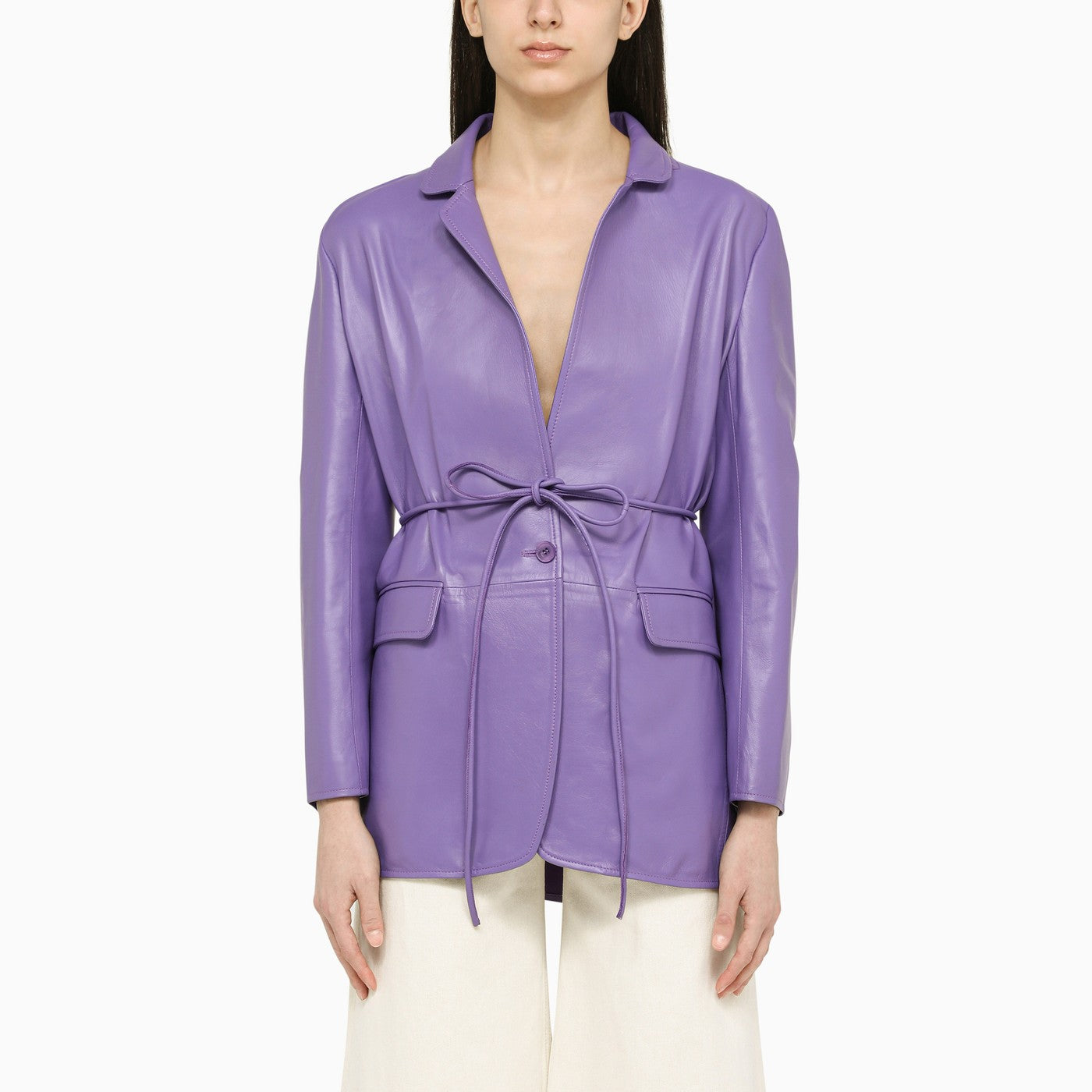 Violet leather single-breasted jacket from SWD by S.w.o.r.d. featuring a drawstring waist, button fastening and two front pockets.