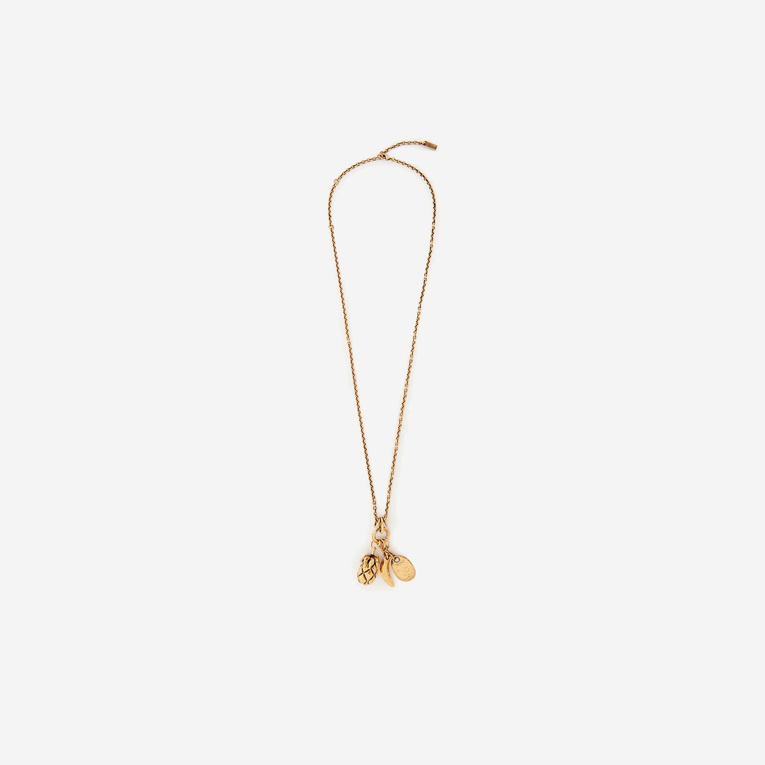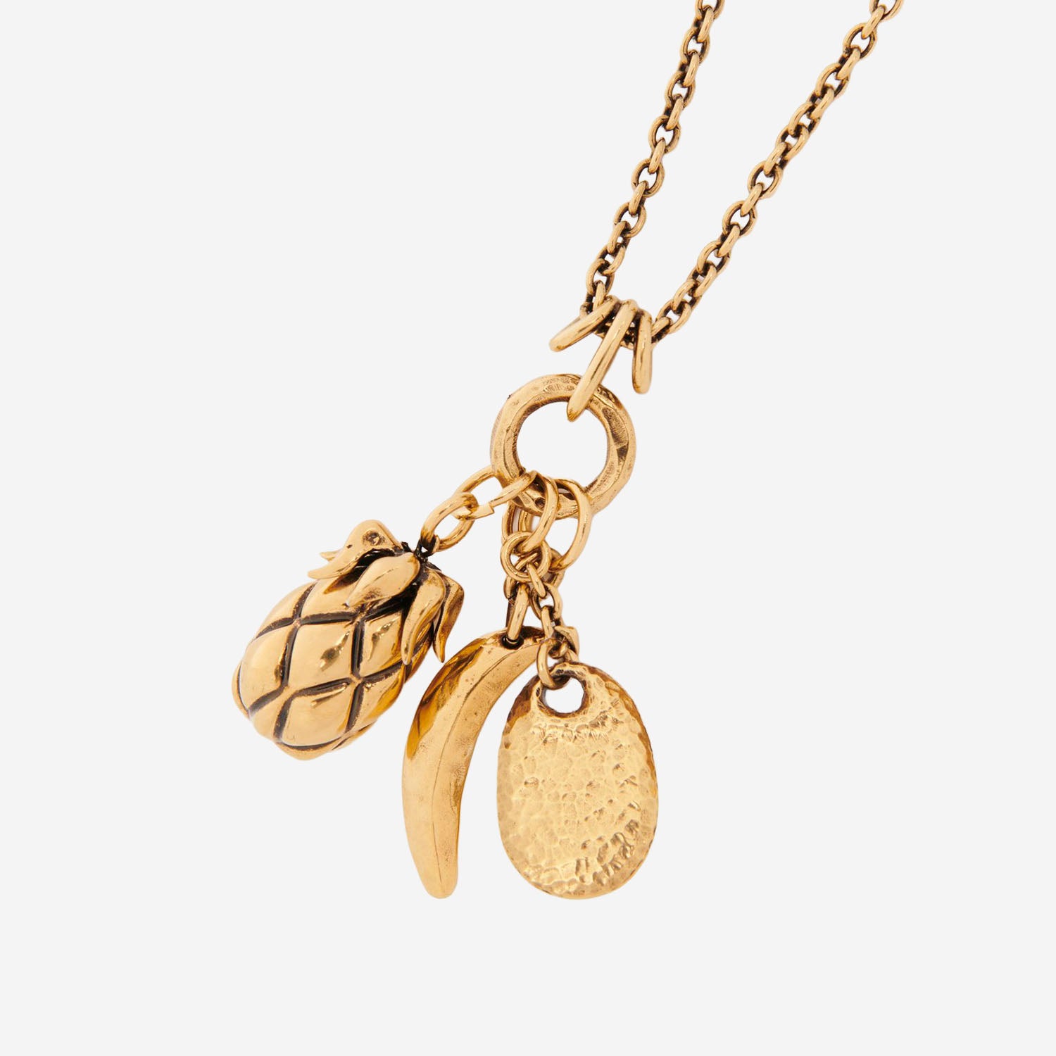 Set on the long chain is a cluster of three pendants: a banana, a pineapple and a petal