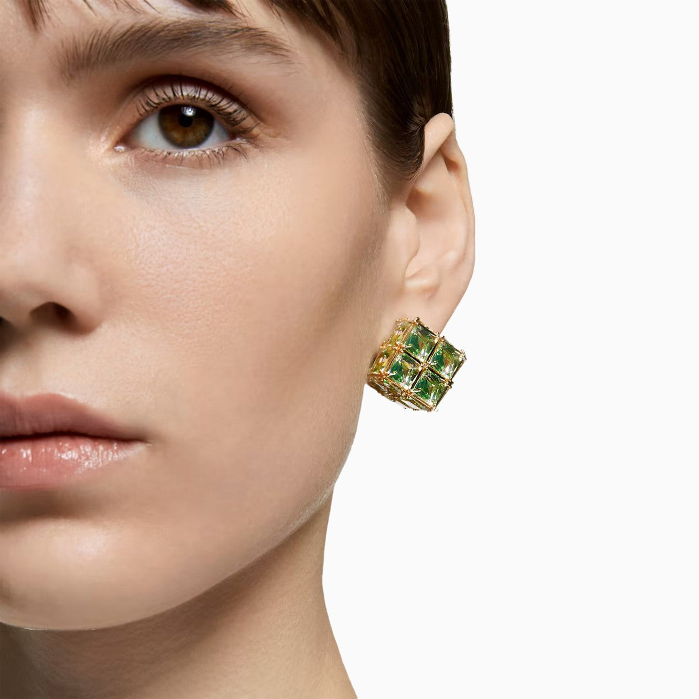 Earrings by Swarovski in green zirconia, featuring a kaleidoscopic effect.