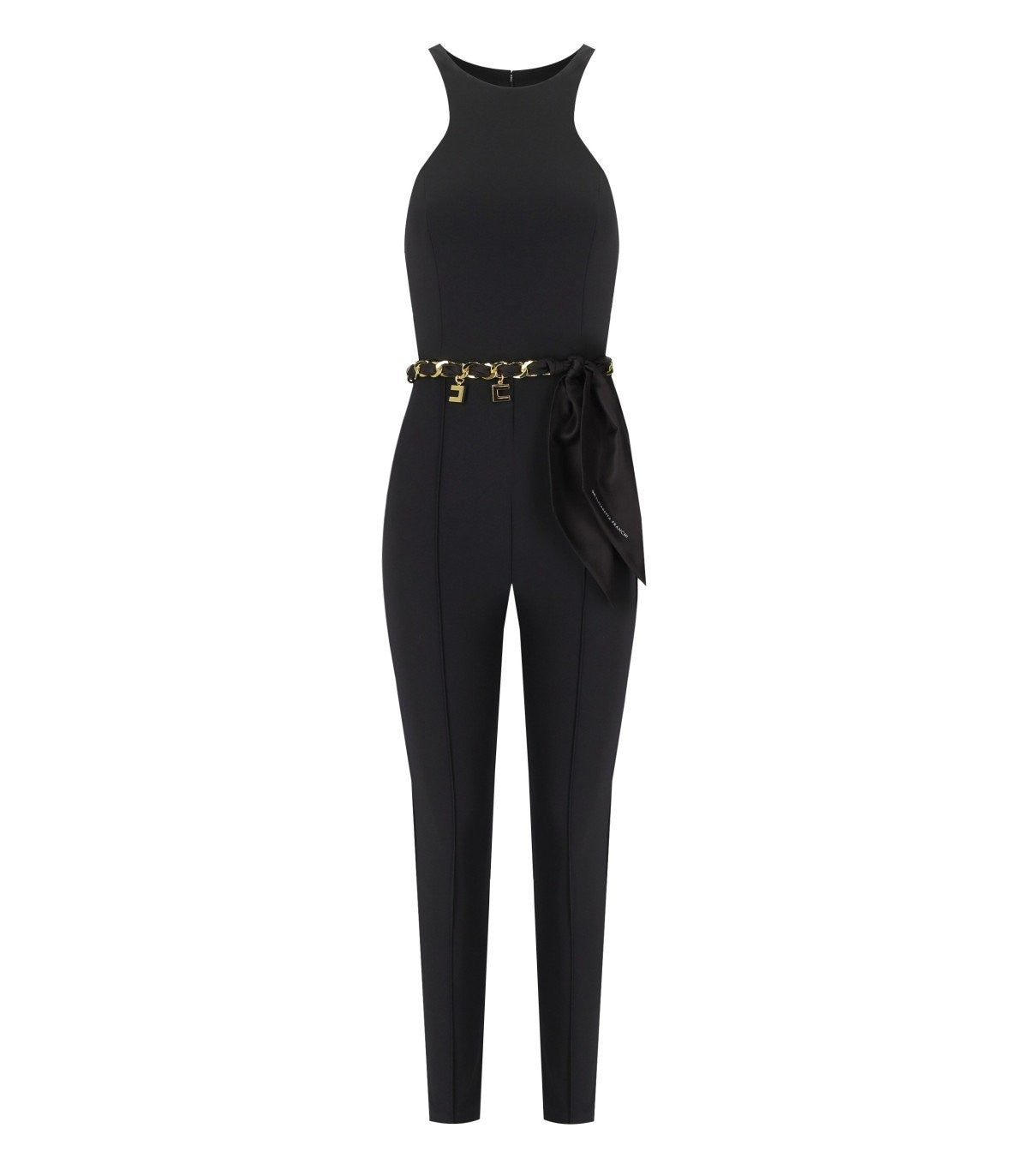 Elisabetta Franchi jumpsuit made in double black crêpe. Halter neckline, waist emphasized by a chain belt with a scarf. French pockets on the hips and flaps on the back. Zip closure on the back. Tight fit. Composition: 96% polyester, 4% elastane.