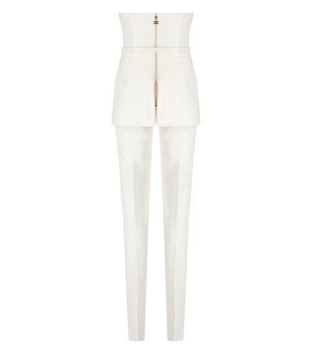 Elisabetta Franchi jumpsuit made of ivory-colored bielastic technical fabric. Sweetheart neckline, basque with flaps that recall the bottom of a blazer. Faux leather belt with logo plaque at the waist, zip closure at the back. Straight leg trousers, regular fit. Composition: 84% polyamide, 16% elastane.