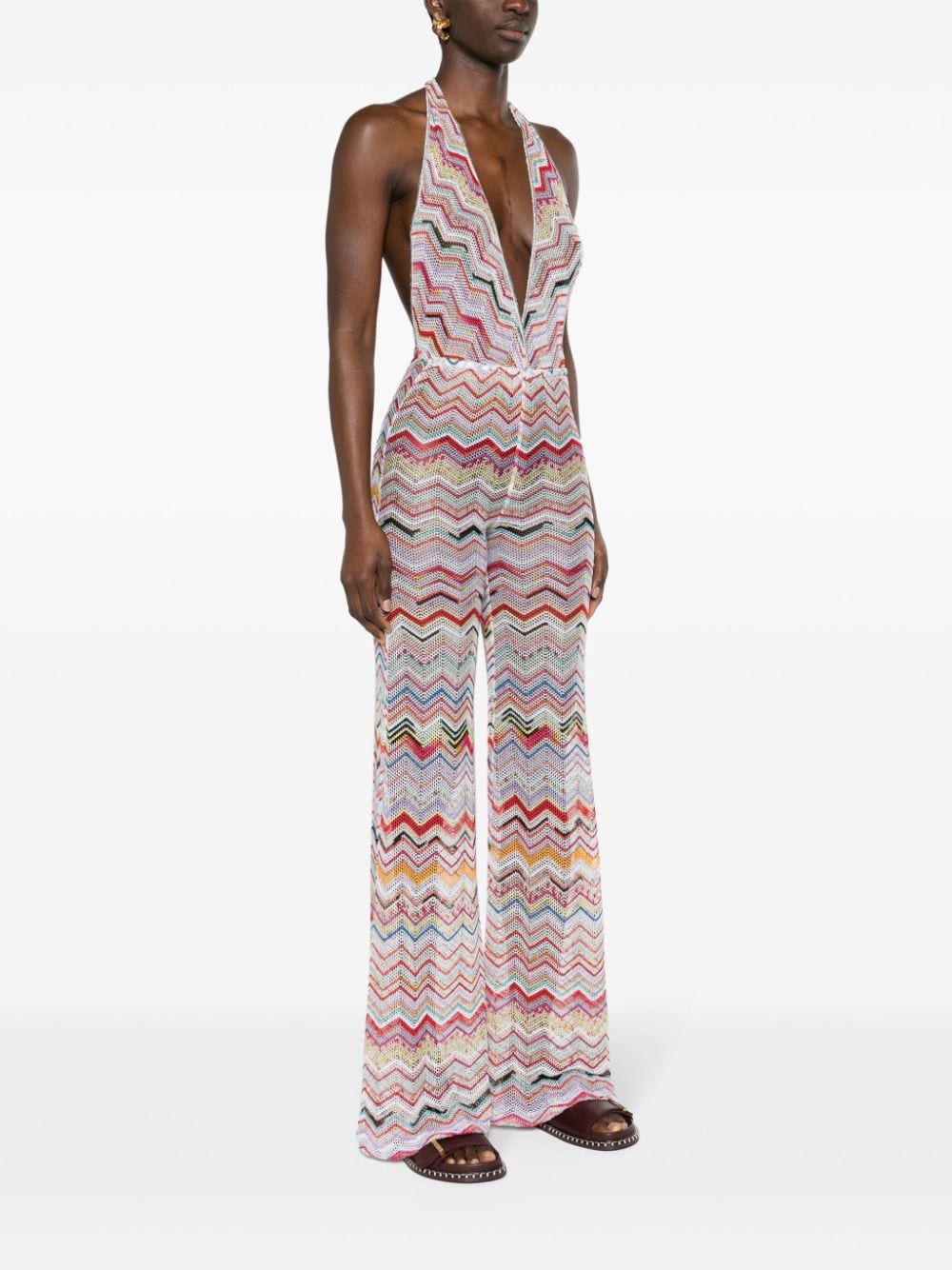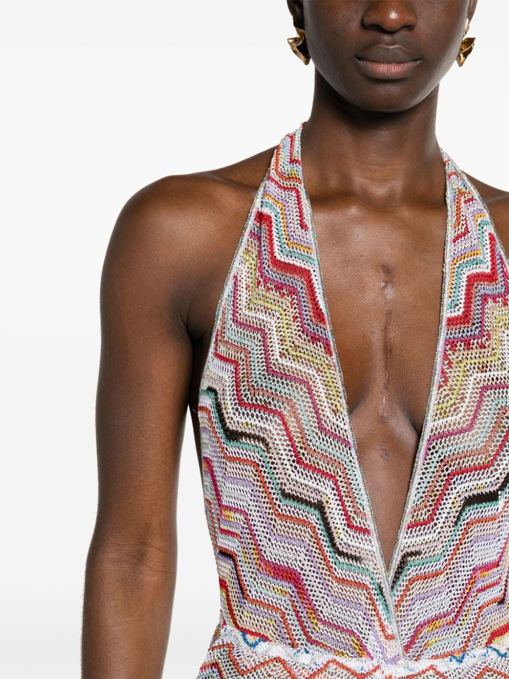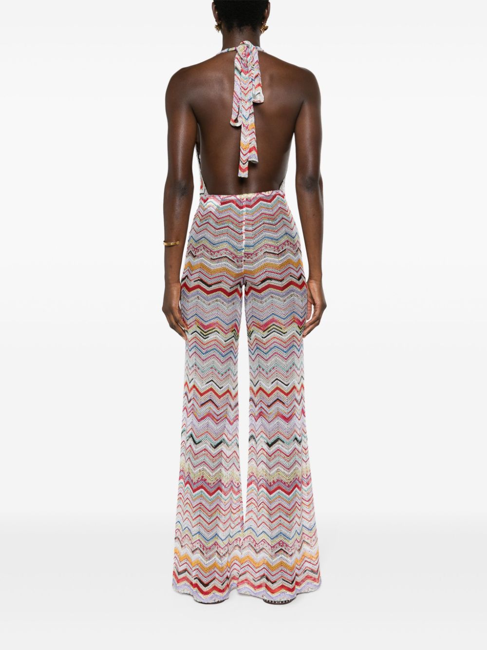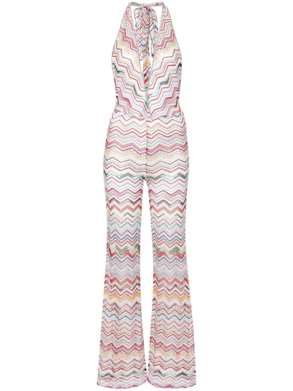 white/multicolour crochet knit signature zigzag woven design lurex detailing V-neck halterneck tie fastening sleeveless open back elasticated waistband flared cuffs The item you receive may differ slightly from the item photographed. This is due to the artisanal nature with which all Missoni products are constructed.