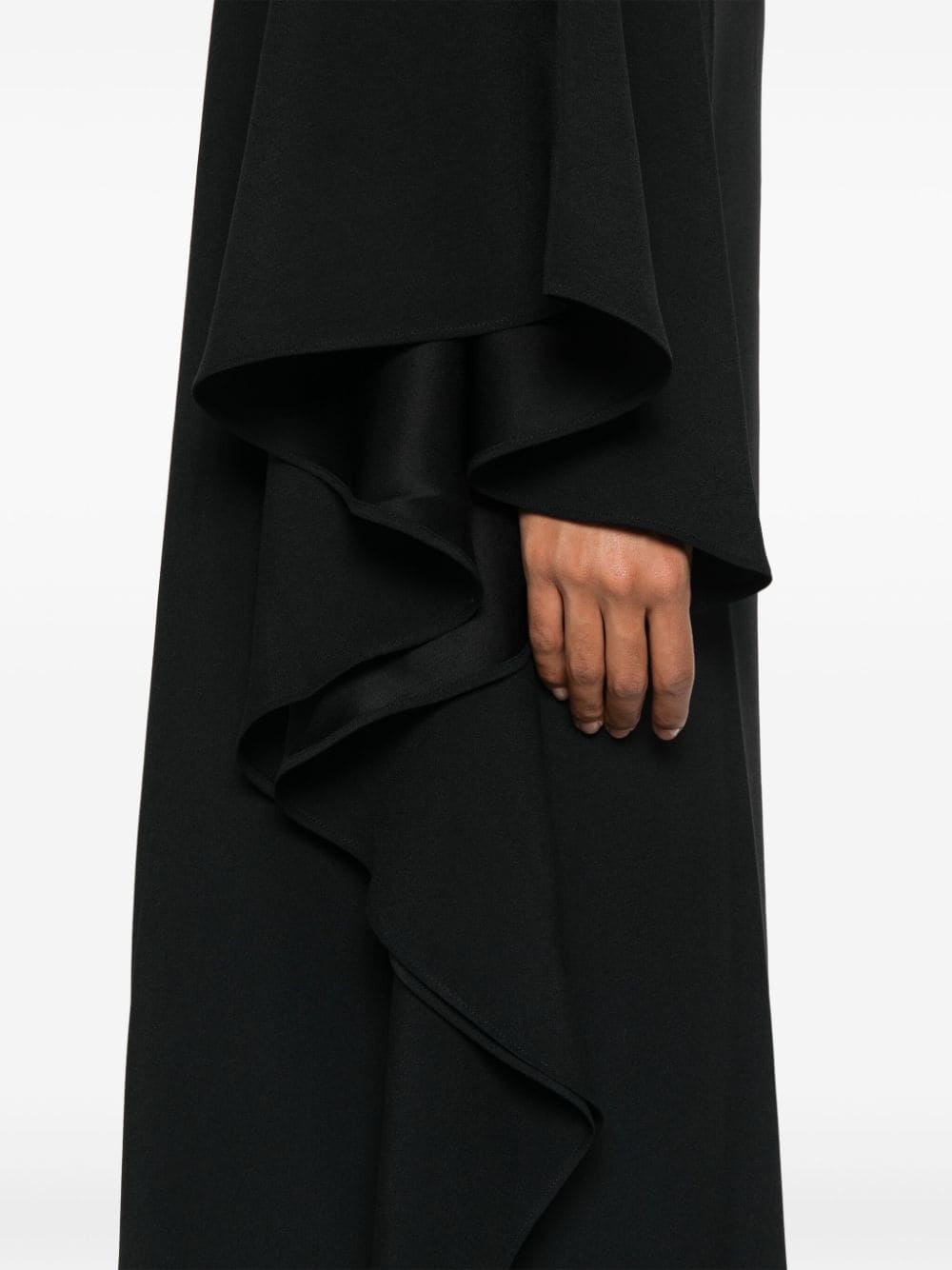 black cady texture one-piece design one-shoulder attached scarf single long sleeve ruffled detailing wide leg unlined concealed side zip fastening