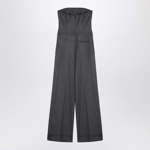 Jumpsuit by The Andamane made of grey mélange wool-blend, featuring a band top, wide-leg trousers with front pleats, side welt pockets, a welt pocket on the back and a turned-up hem.