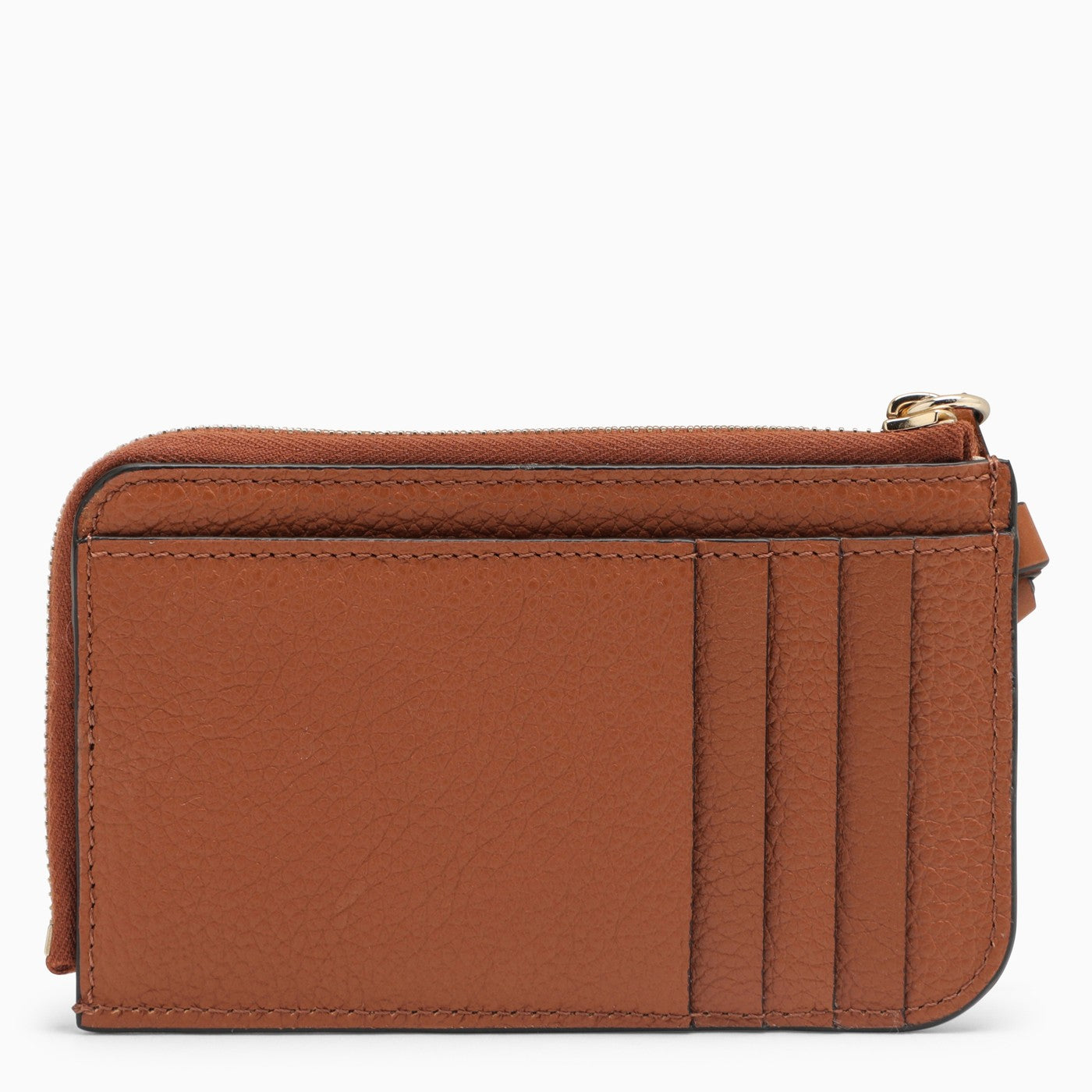 Brown leather card case by Chloé, featuring a zipped compartment, several card slots, front letering logo and gold-coloured metal hardware.