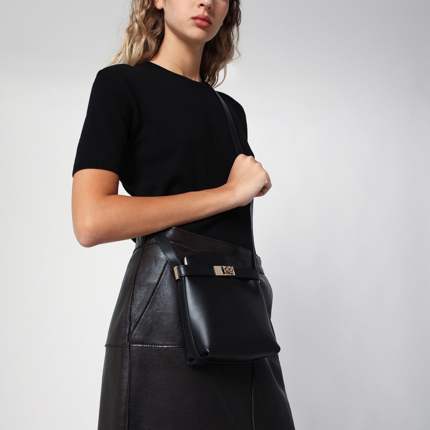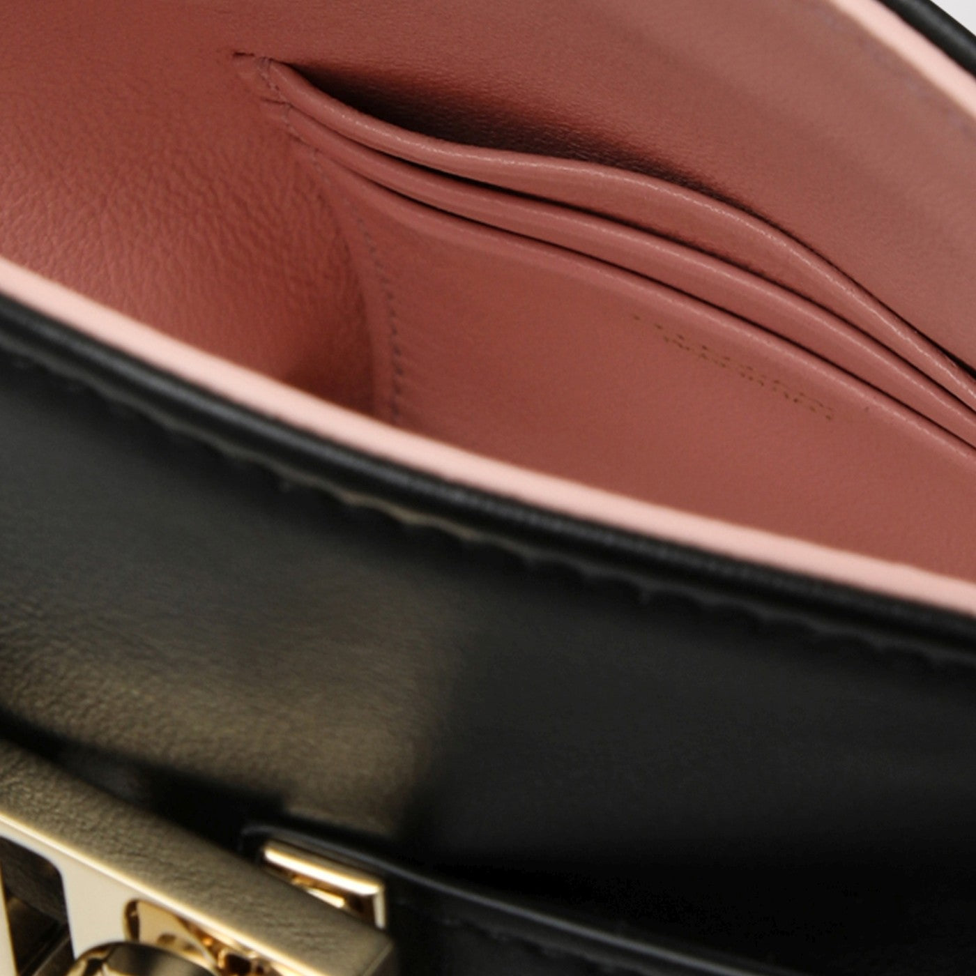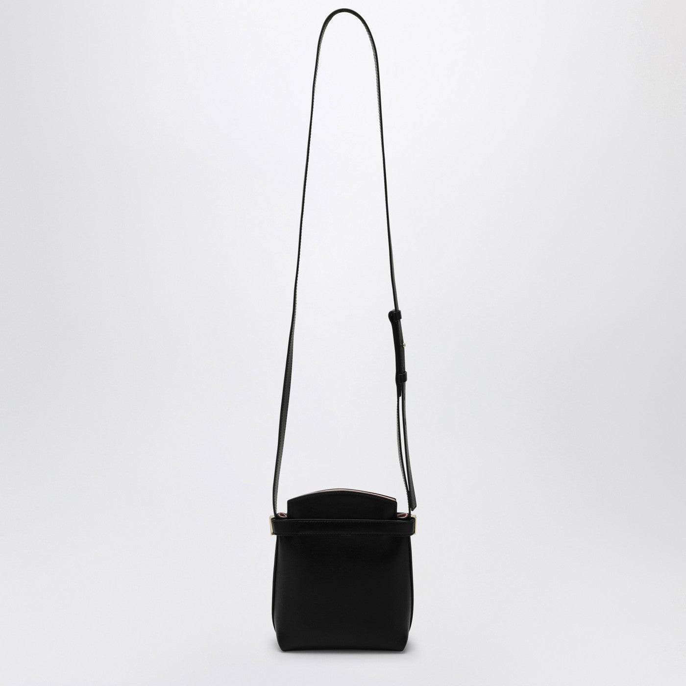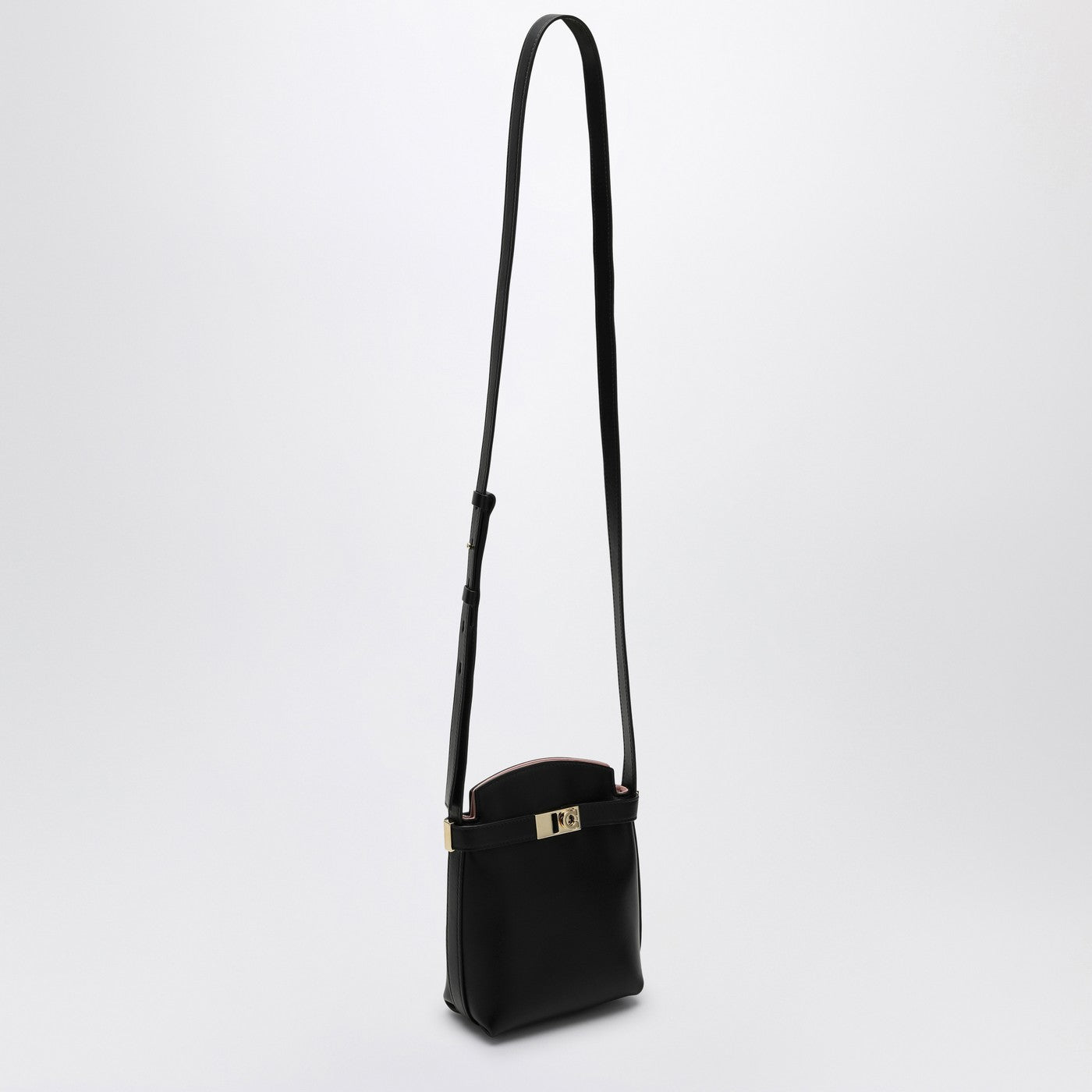 Phone holder by Ferragamo in two-tone black and pink leather, featuring an adjustable shoulder strap, a gold-coloured metal Gancini buckle strap and card slots on the inside.