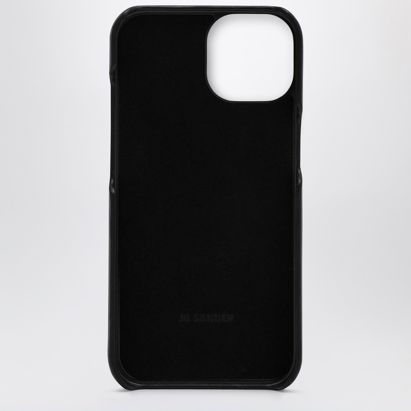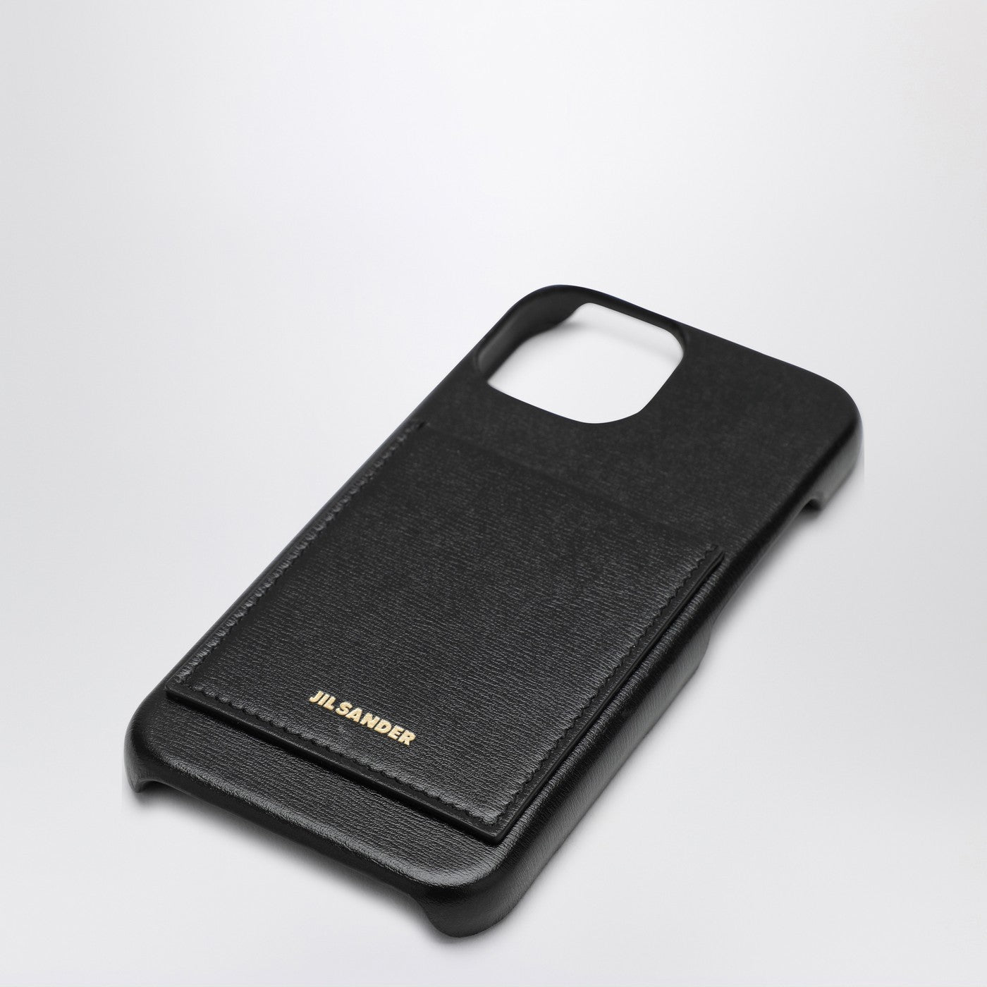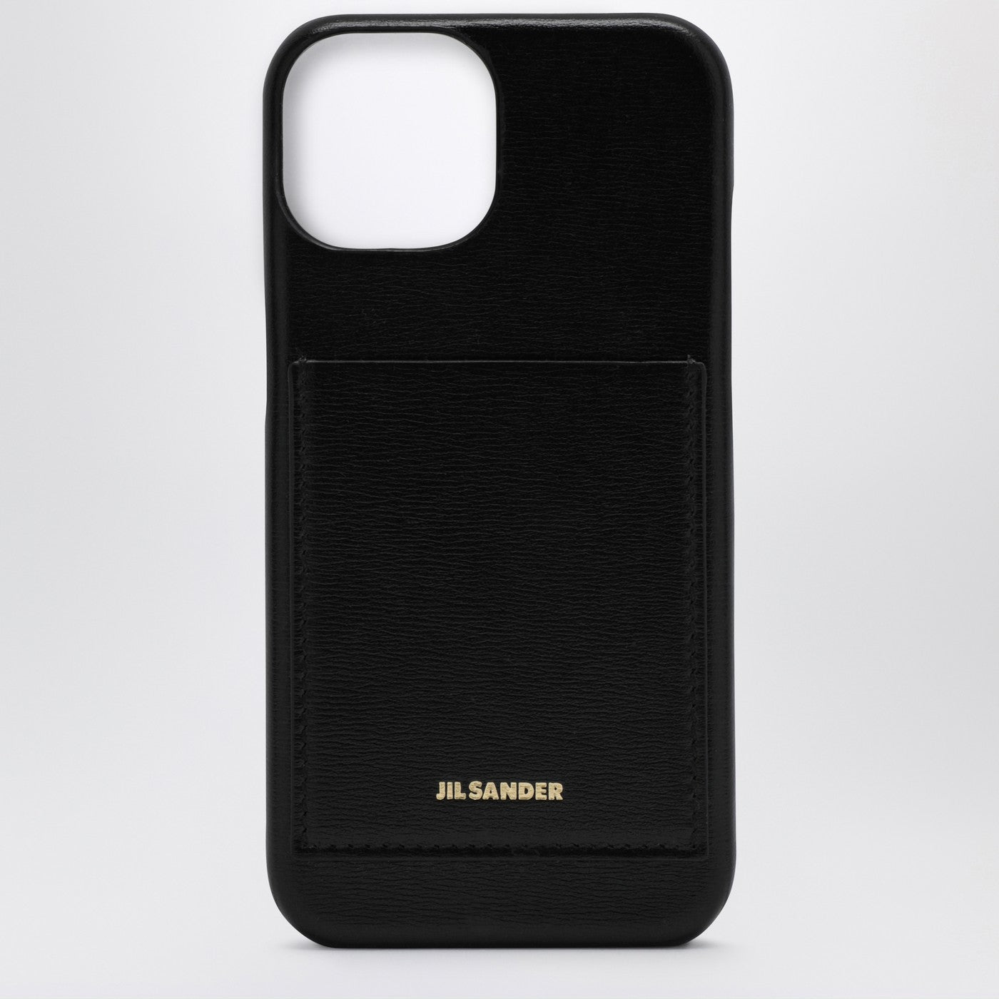 iPhone case by Jil Sander in black leather, featuring a flat slit pocket on the back and logo print.
