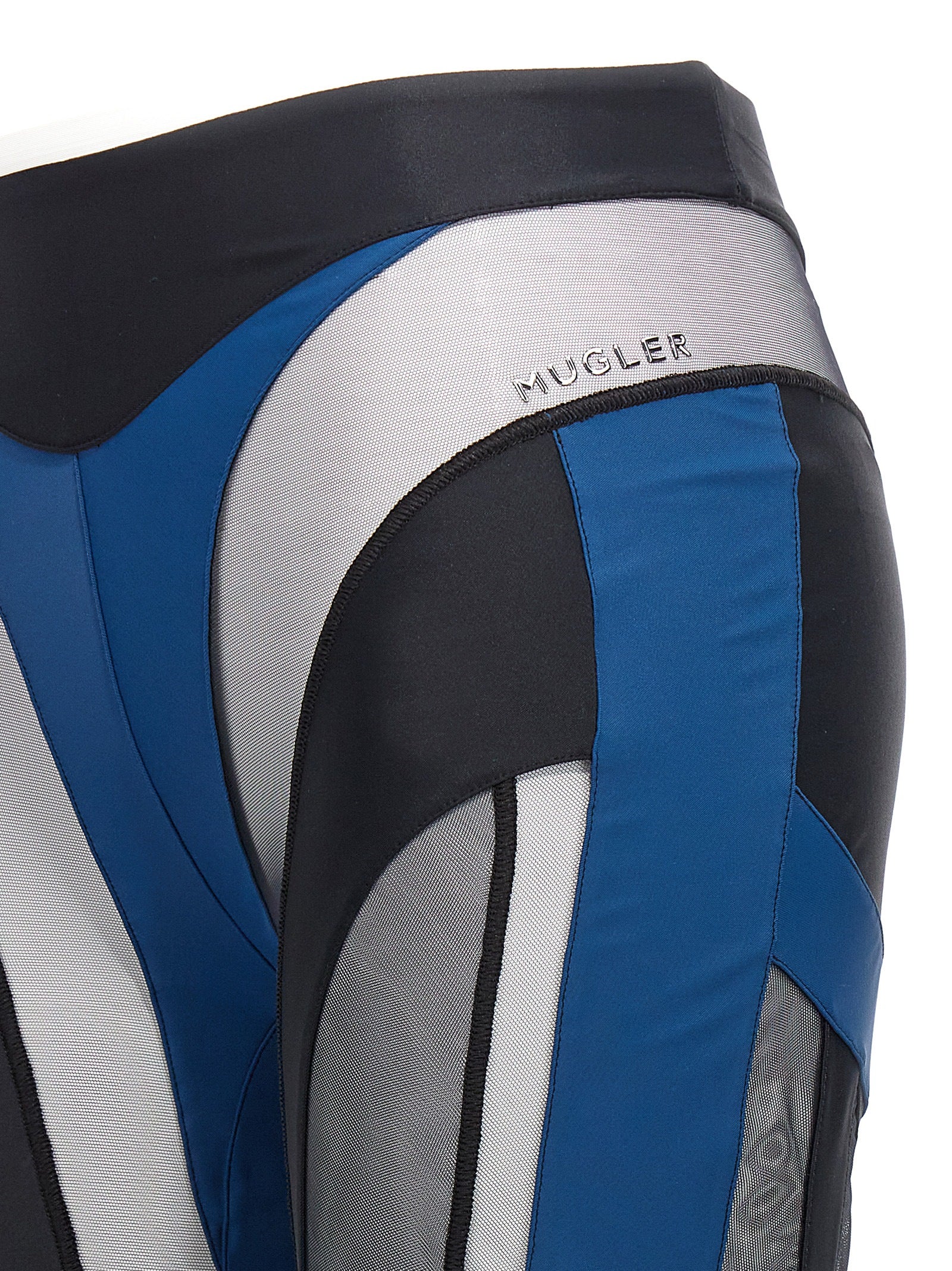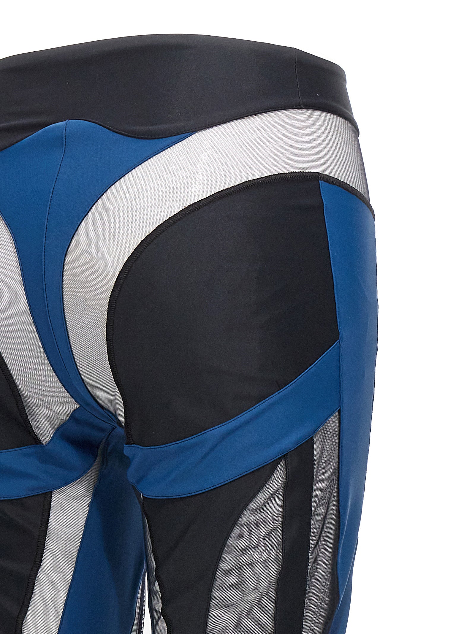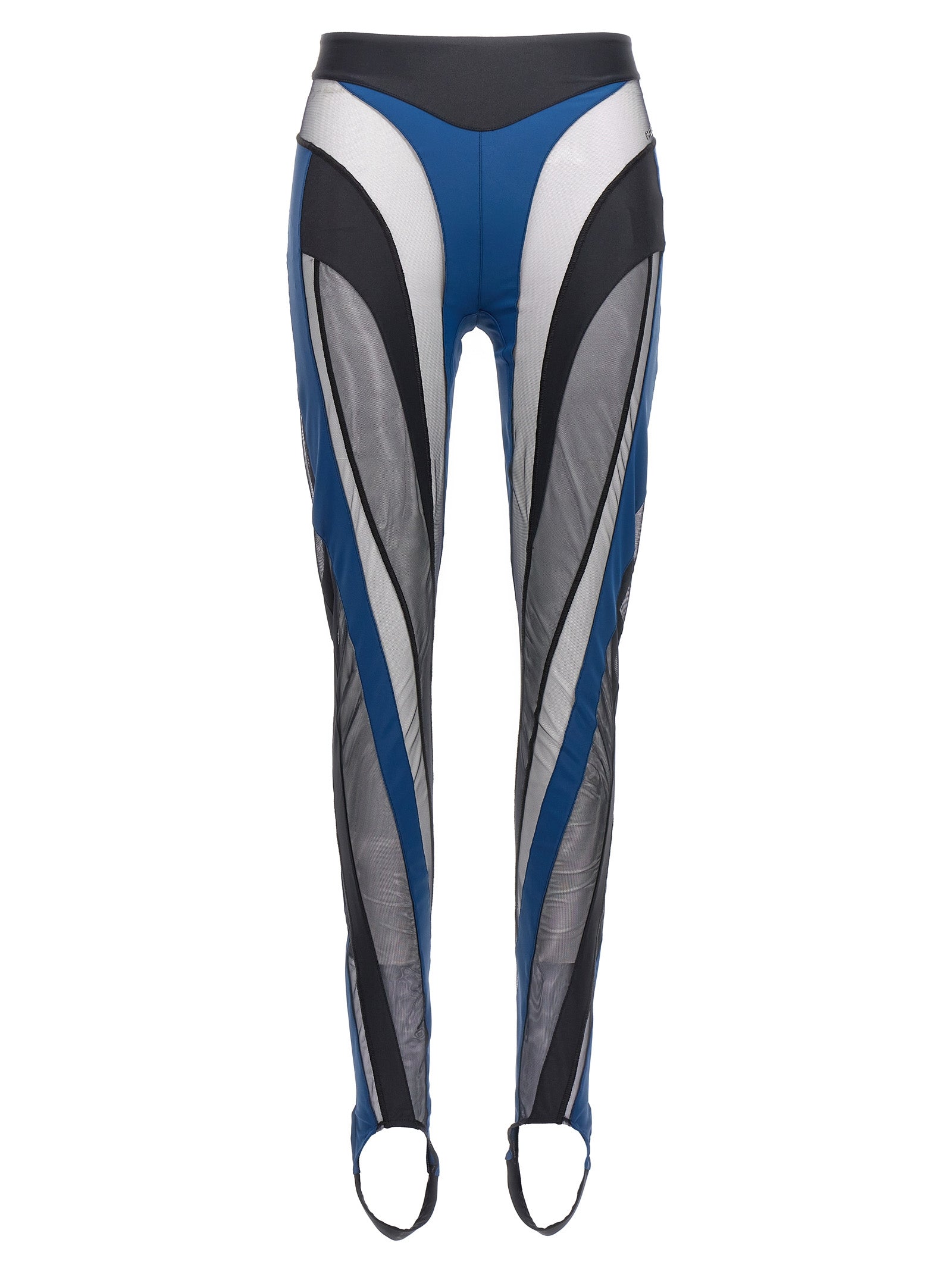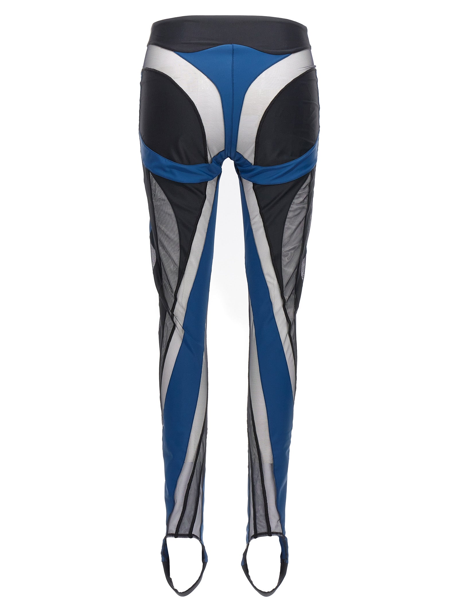 Stretch fabric leggings with contrasting inserts, transparent tulle, elastic waistband, and foot straps on the leg bottoms.