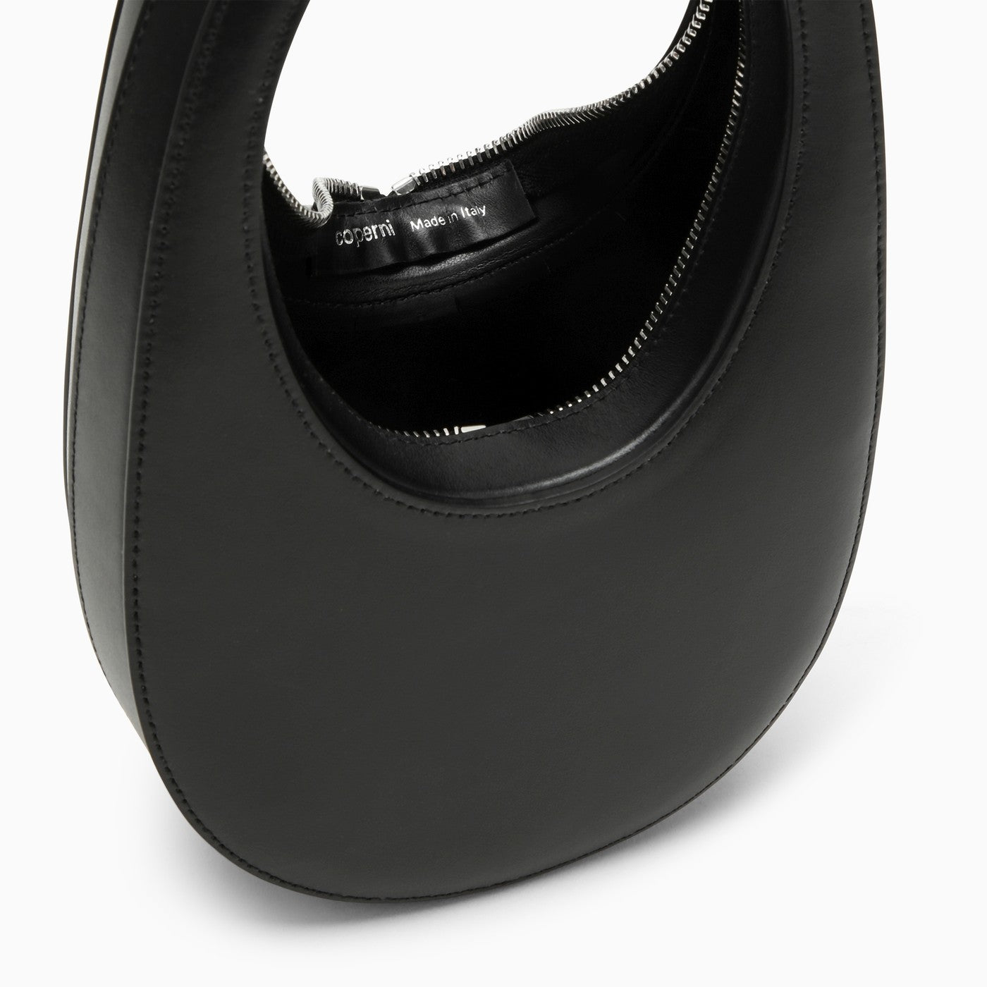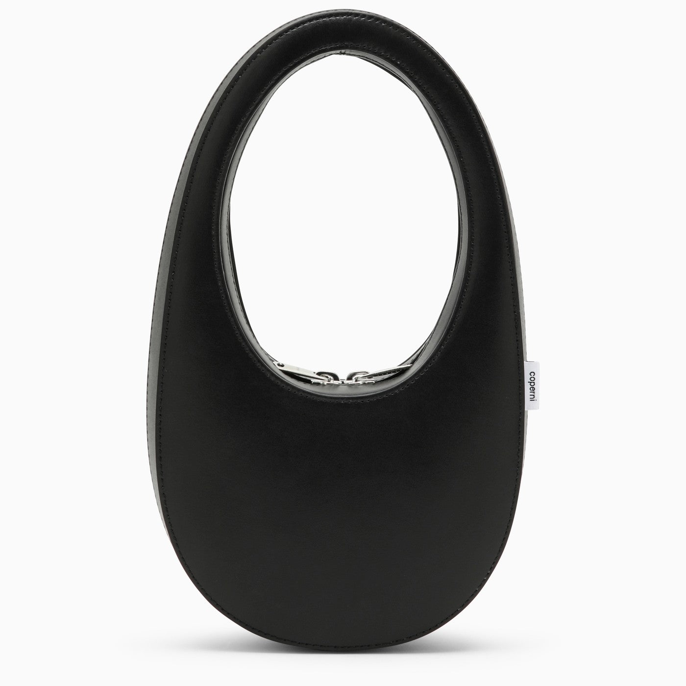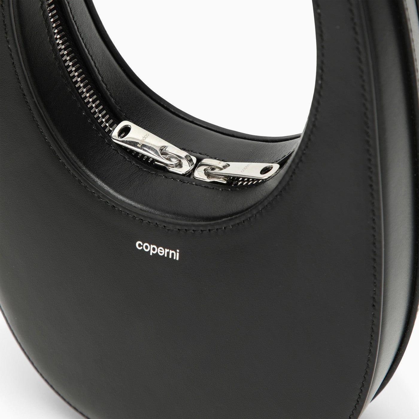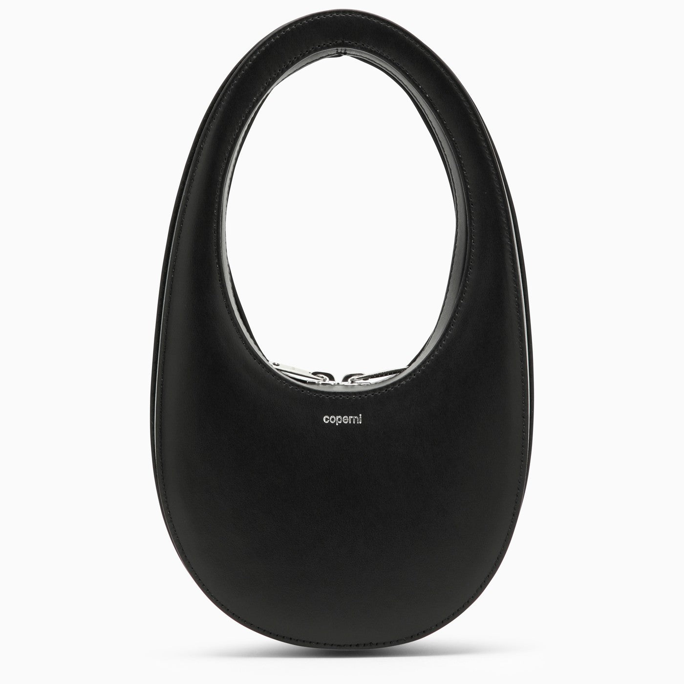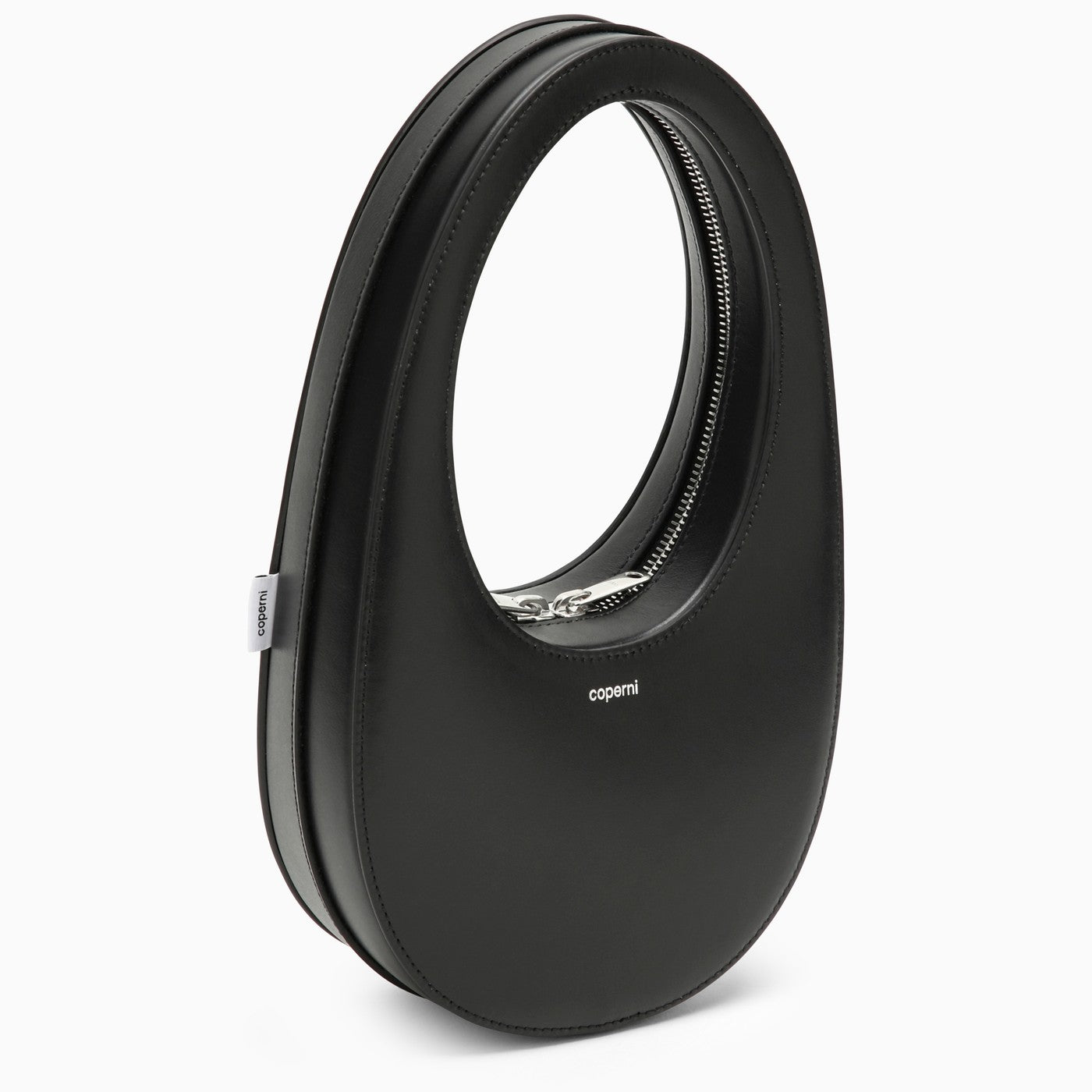 Black leather mini bag from Coperni featuring oval design, single handle, double zip fastening, external logo plaque, contrasting front lettering, single compartment and silver-coloured metal hardware.