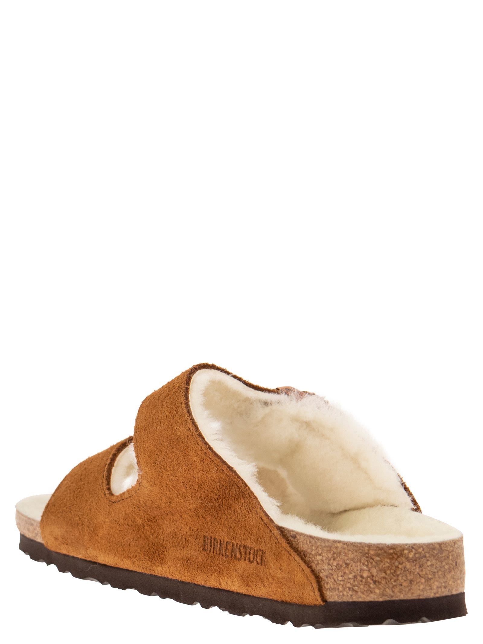 The much-loved BIRKENSTOCK Arizona classic in high-quality genuine suede is shown here in a particularly comfortable and soft version. Warm feet in style thanks to the natural lamb fur in the insole and lining of the straps. The ideal shoe for cosy winter evenings in front of the fireplace! - Anatomical cork and latex footbed - Upper: suede leather with lamb fur lining - Insole: lamb fur - Outsole: EVA - Strap with lamb fur lining - Narrow fit: Narrower plant for slender feet DESIGNER ID: 1001135 MINK