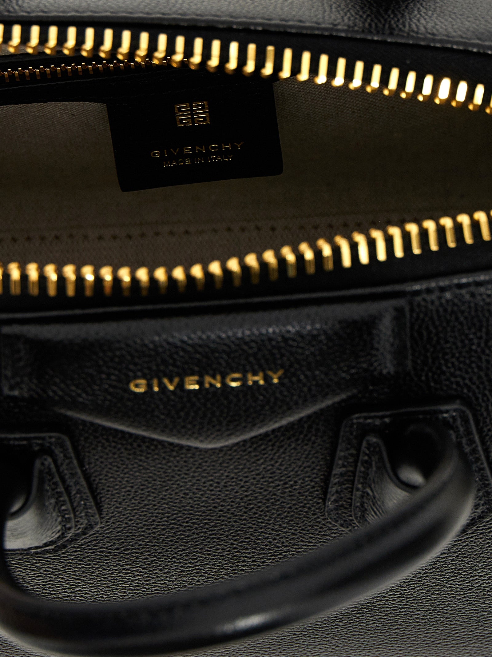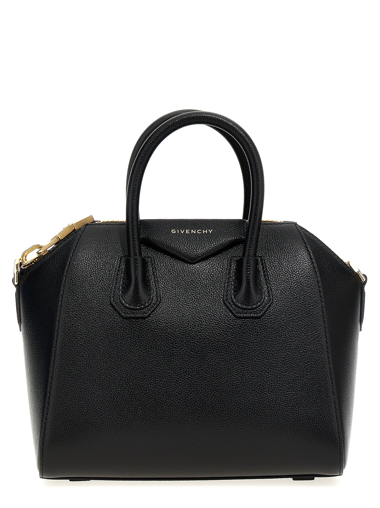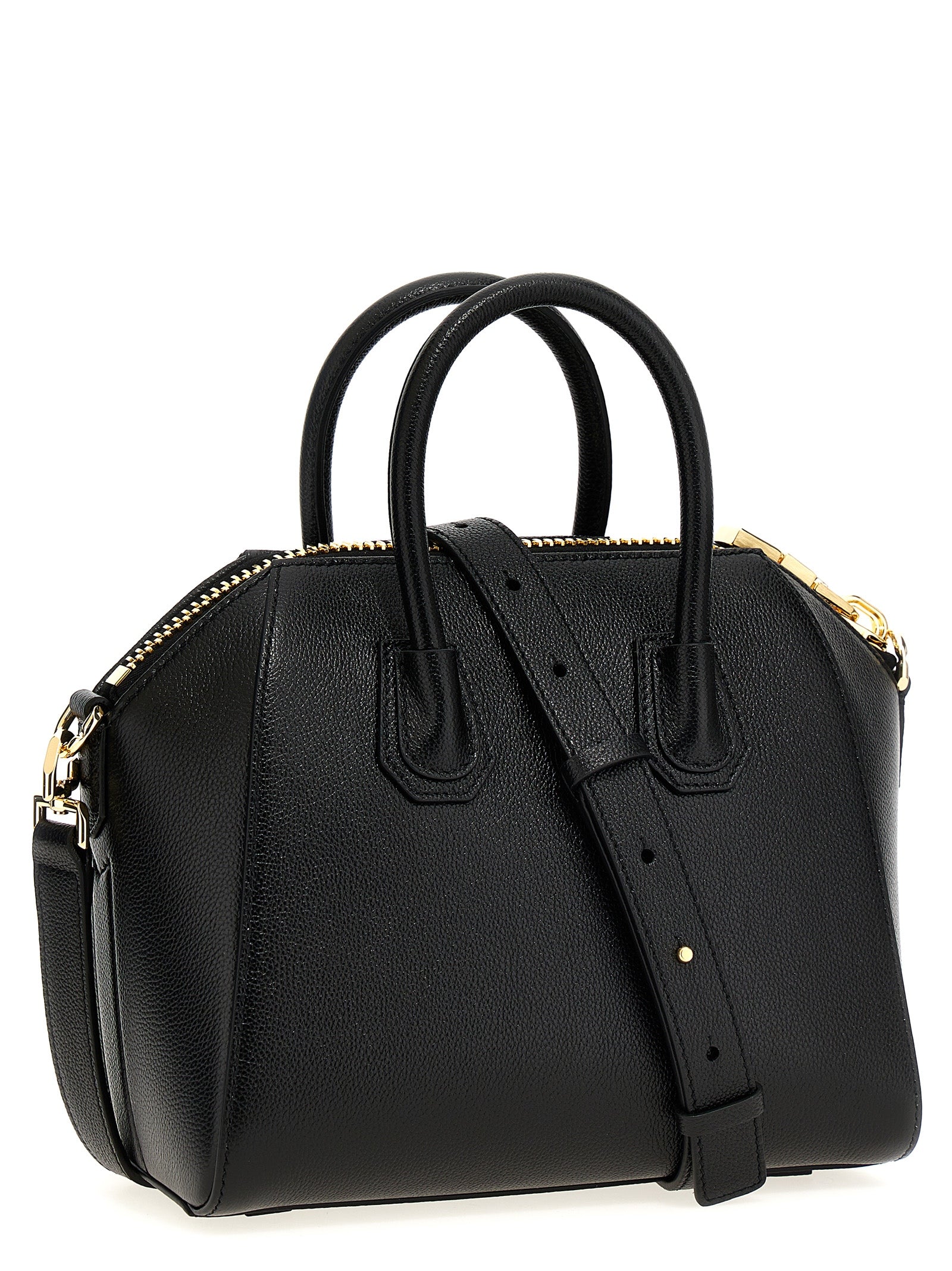 'Antigona' mini handbag in full-grain calf leather, zip closure, double handle, adjustable and removable shoulder strap, and front embossed logo.