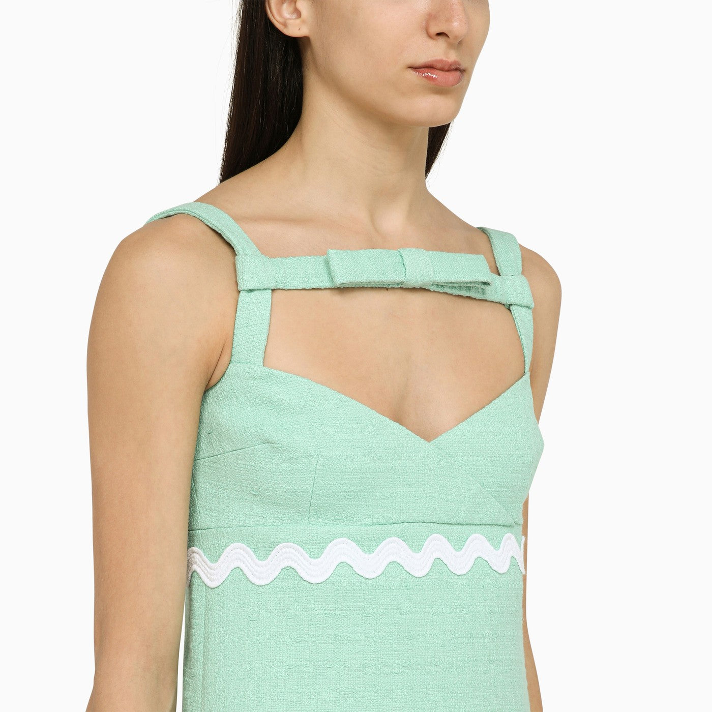 Mint green cotton mini dress by Patou features a back zip fastening, a bow at the front, thin straps and white wave embroidery.