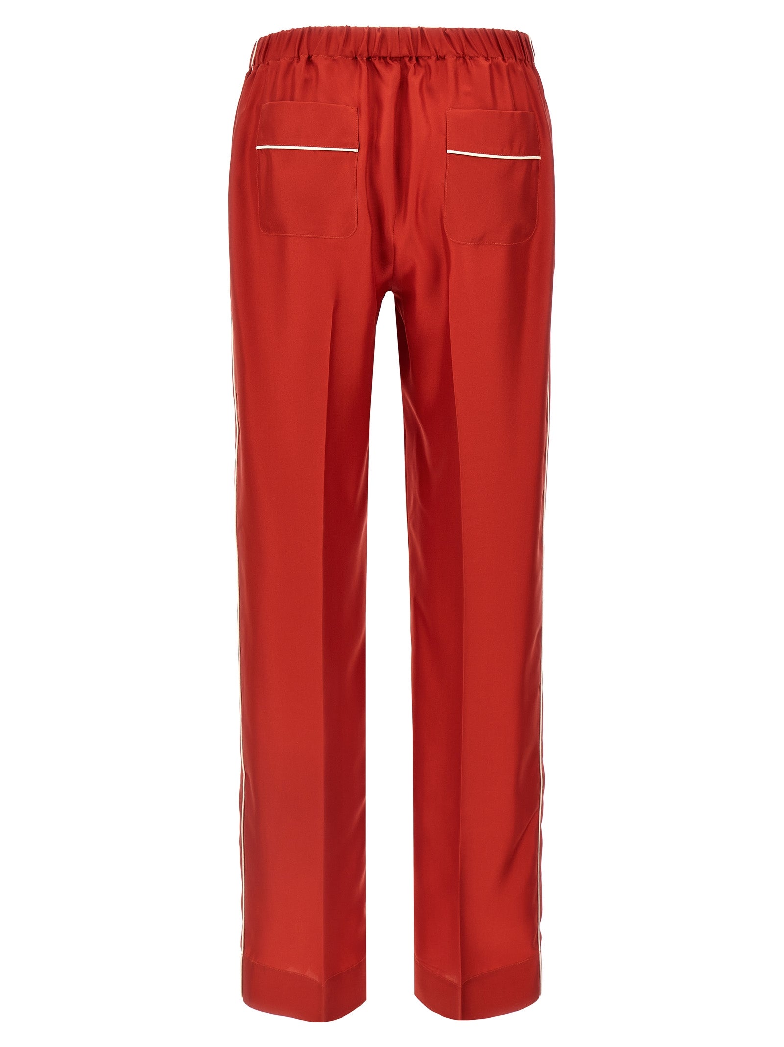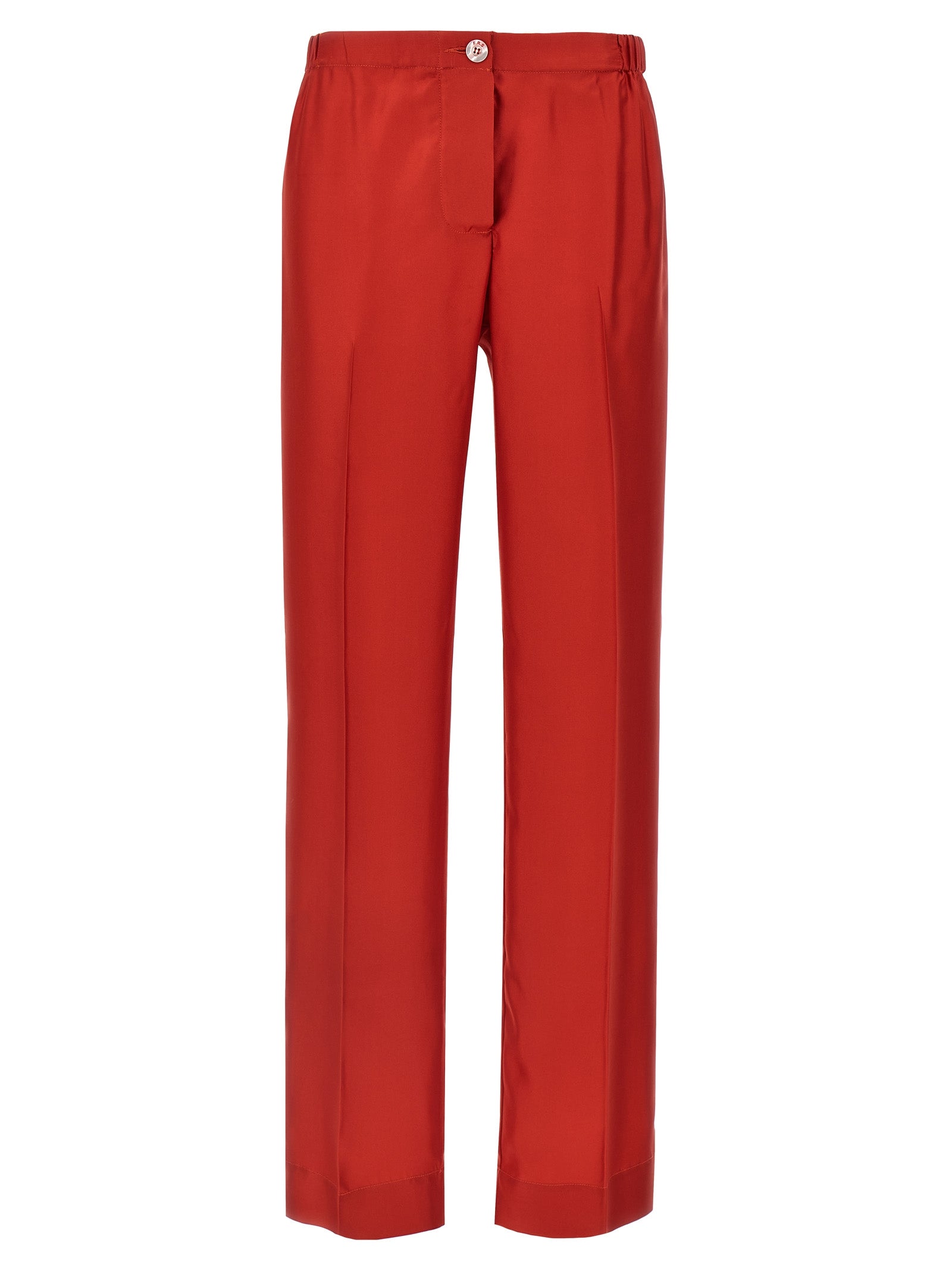 'Etere 6°' silk twill pants with contrast piping, flap with buttons, elastic waistband, pockets, straight leg with stretched crease.