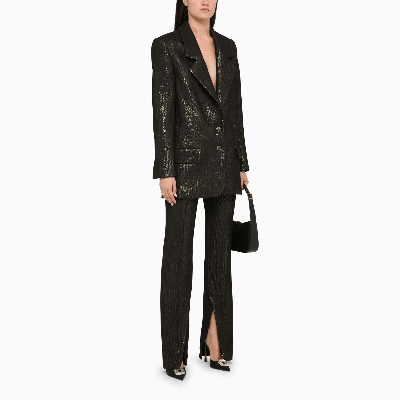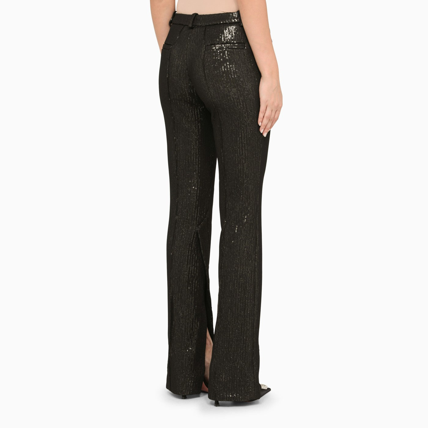 Black sequin trousers by The Mannei featuring slits at the bottom, waist loops and back welt pockets.