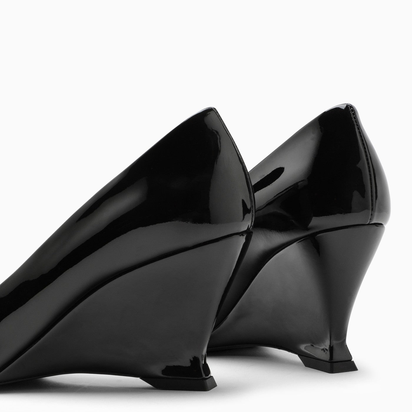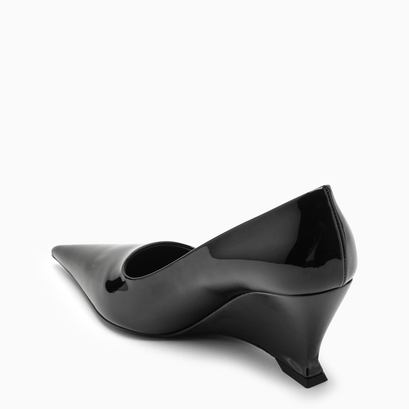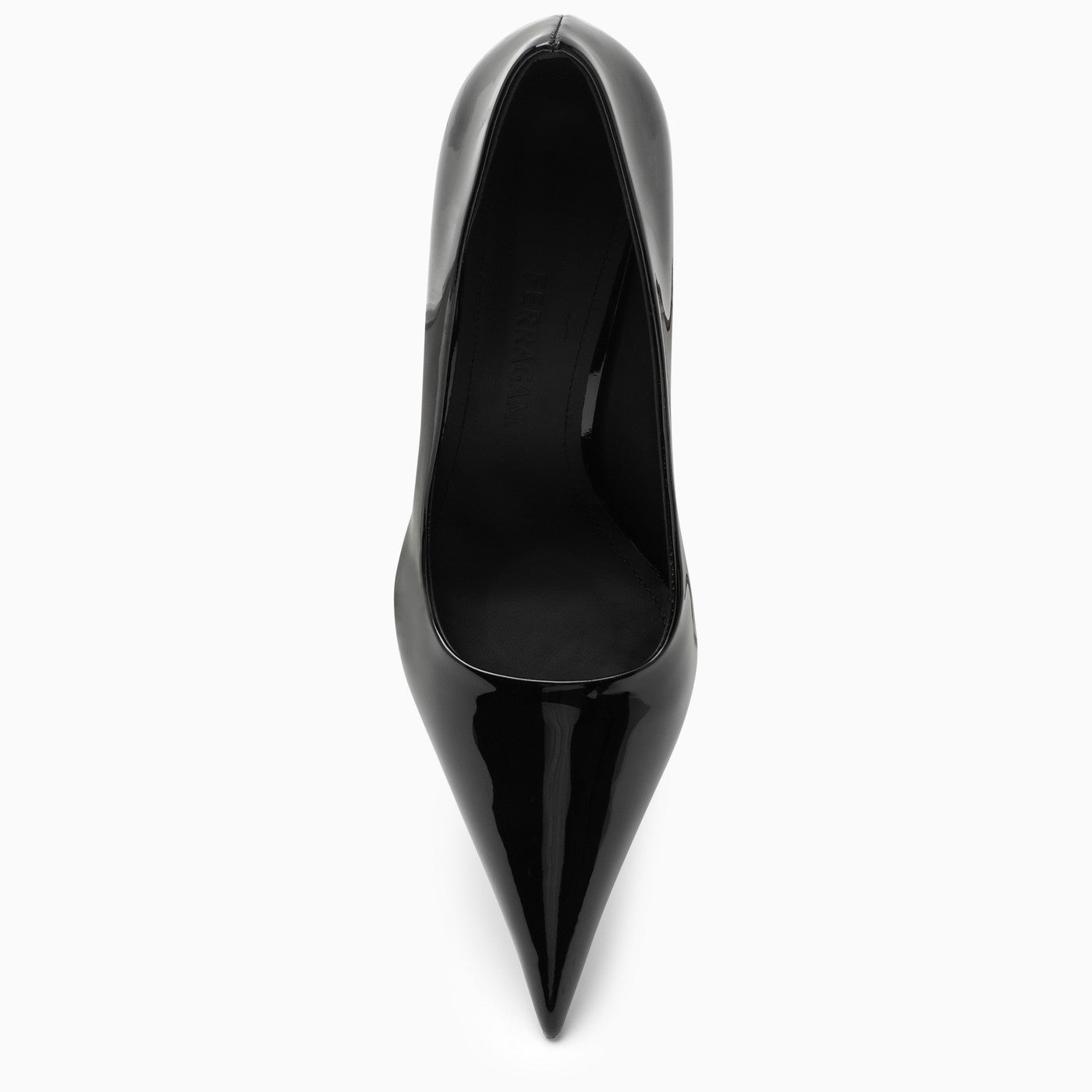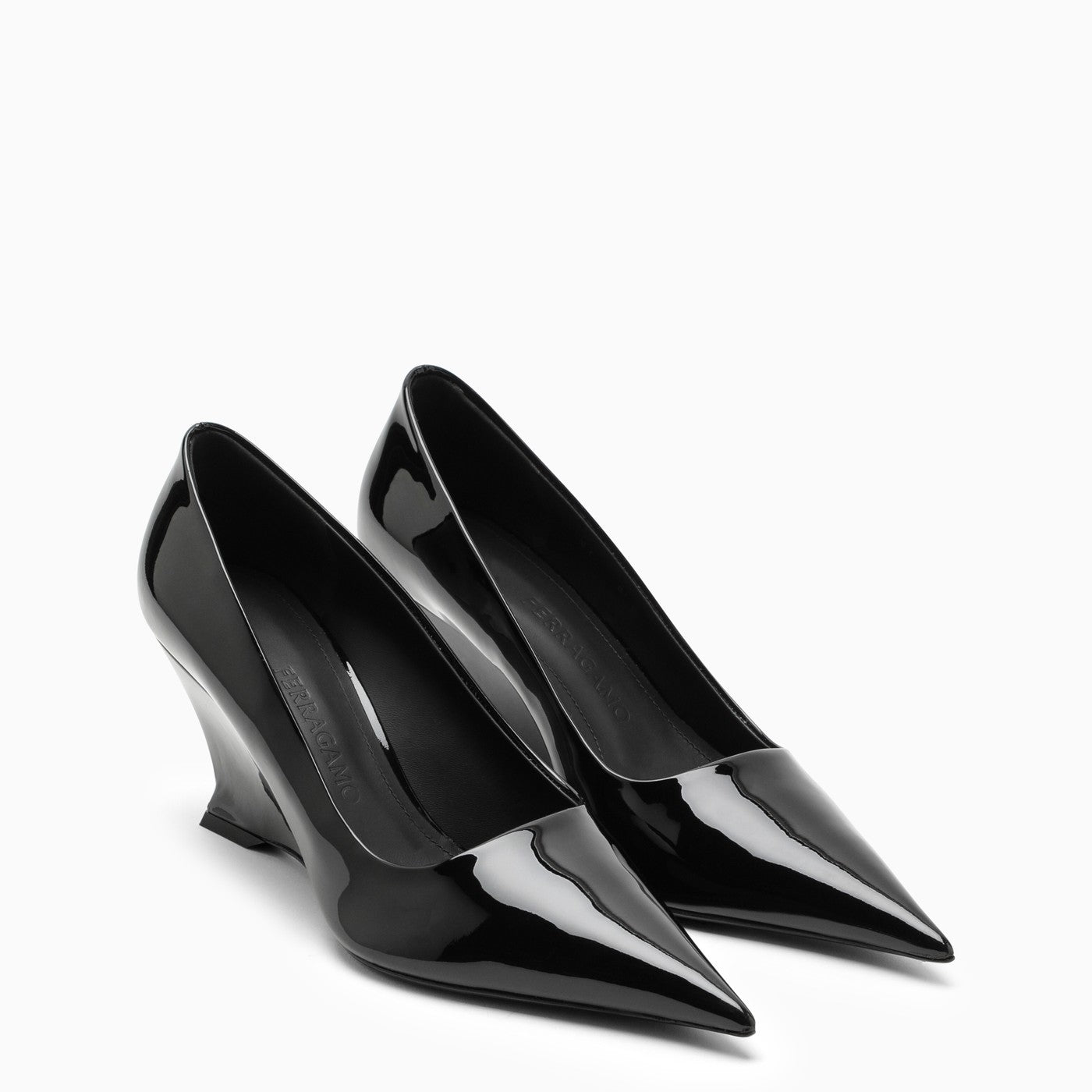 Black patent leather pumps by Ferragamo with a pointed design and leather sole.