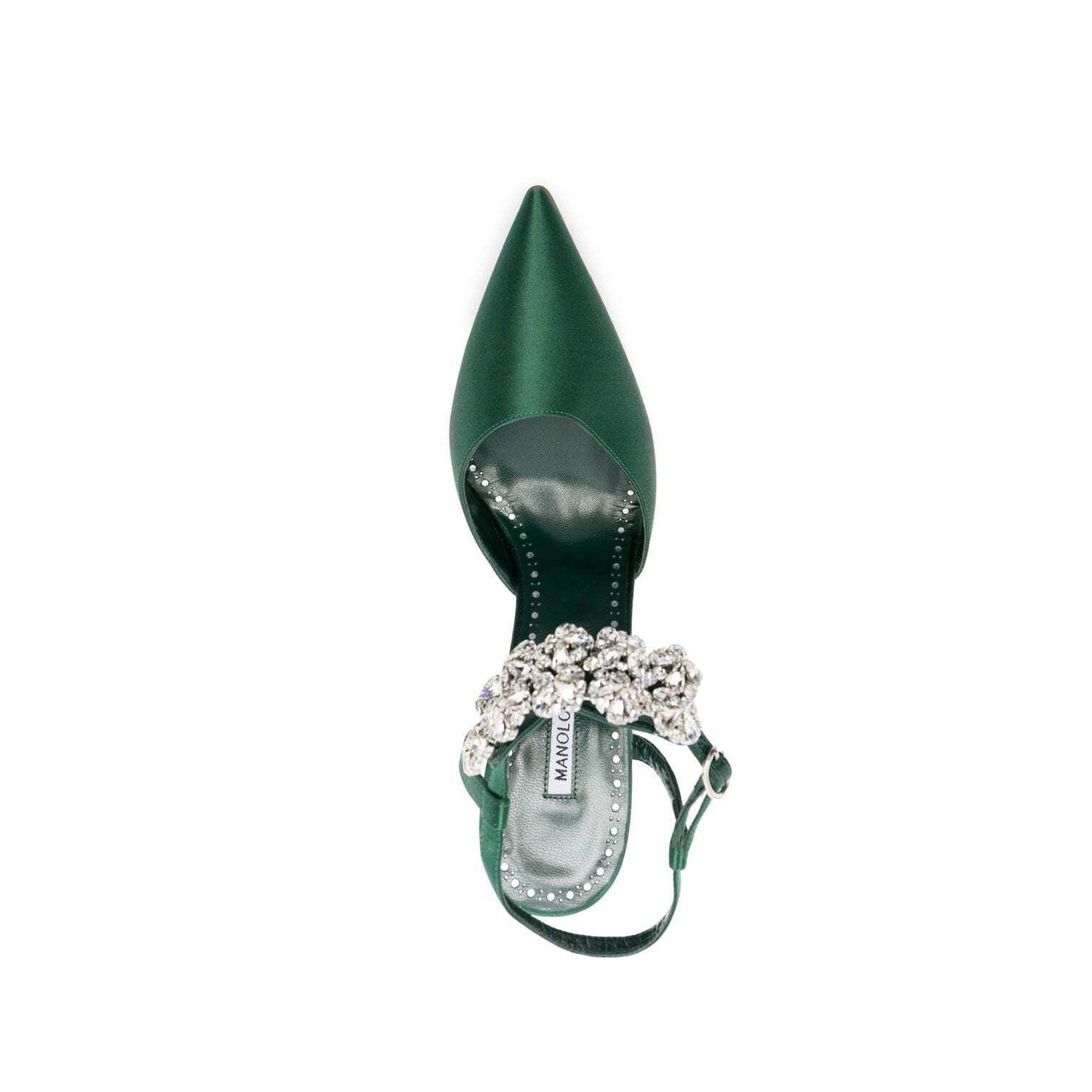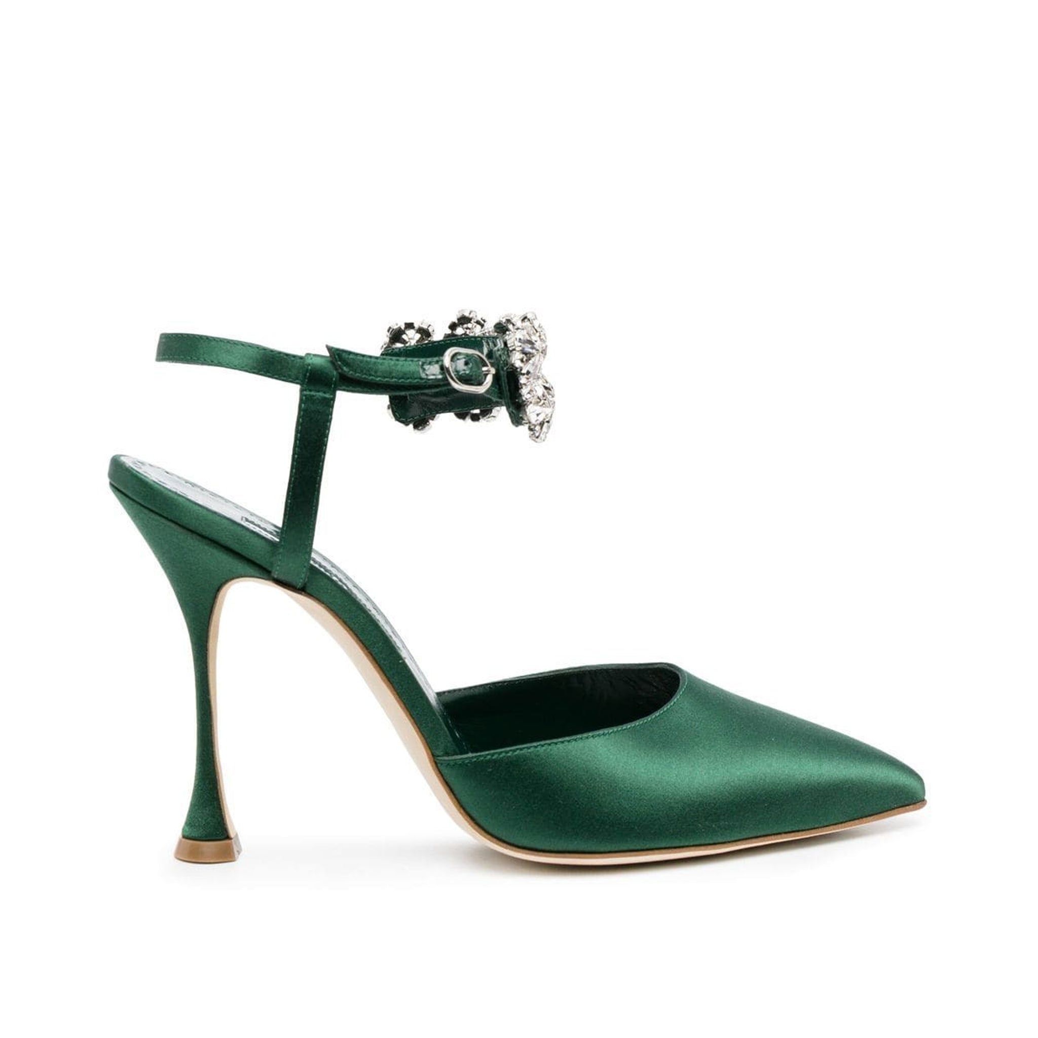 - Composition: 100% silk - Leather insole and sole - Pointed toe - Ankle side buckle fastening - Crystal embellishments - Heel 10,5 cm / 4,1 in - Made in Italy -