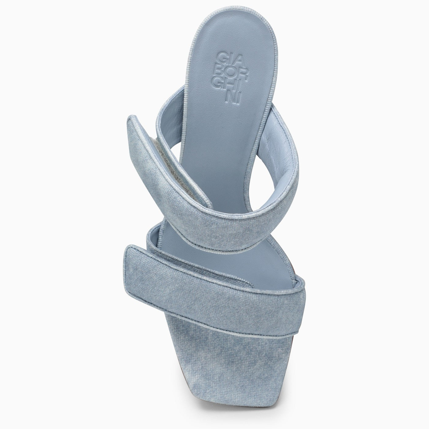 High-heeled sandal by Gia Borghini in shaded denim with double Velcro strap and square toe.