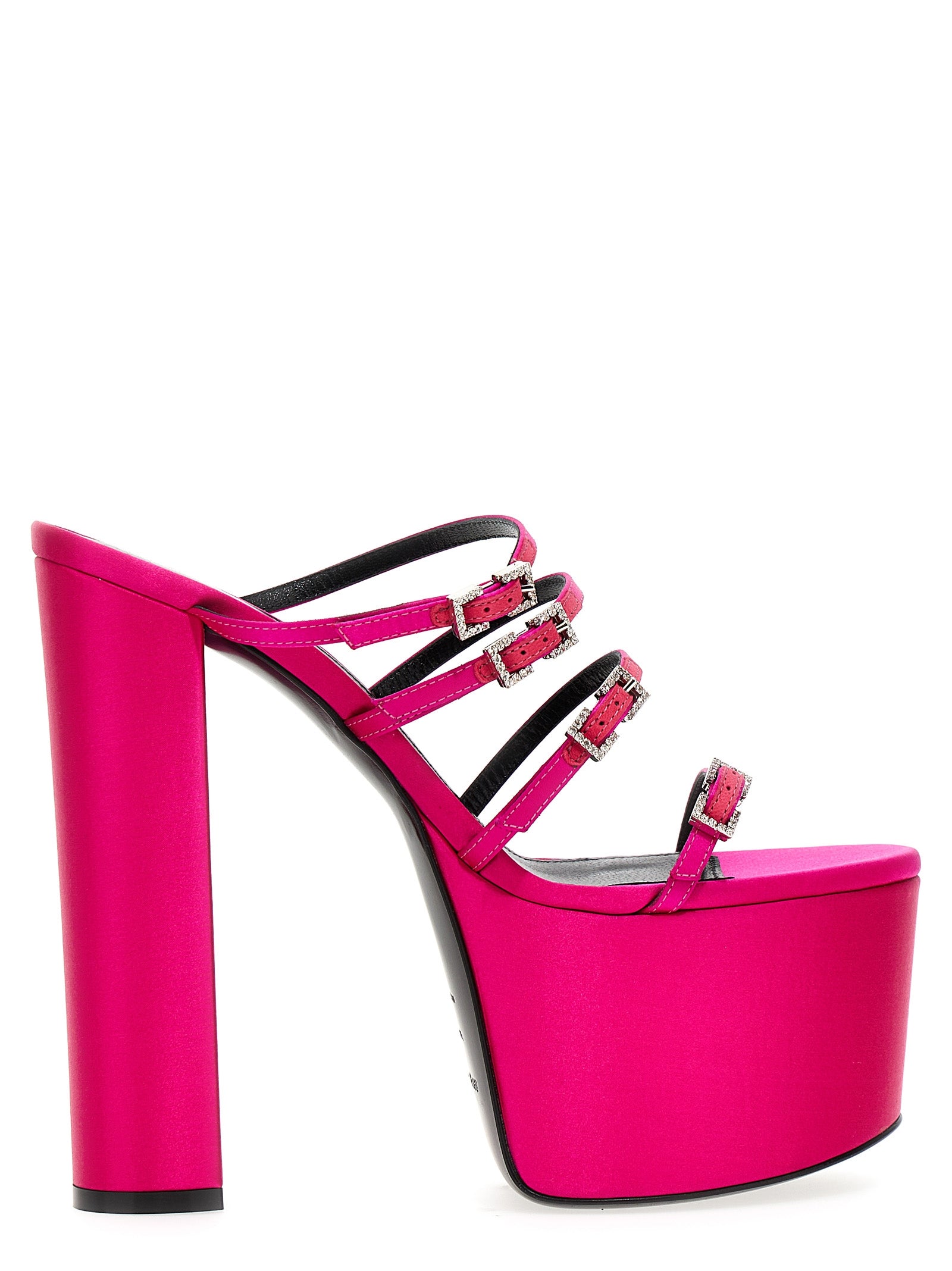 'Evangelie' Cashmere rossi x Evangelie Smyrniotaki satin sandals with straps with buckle and crystals, chunky heel and plateau.