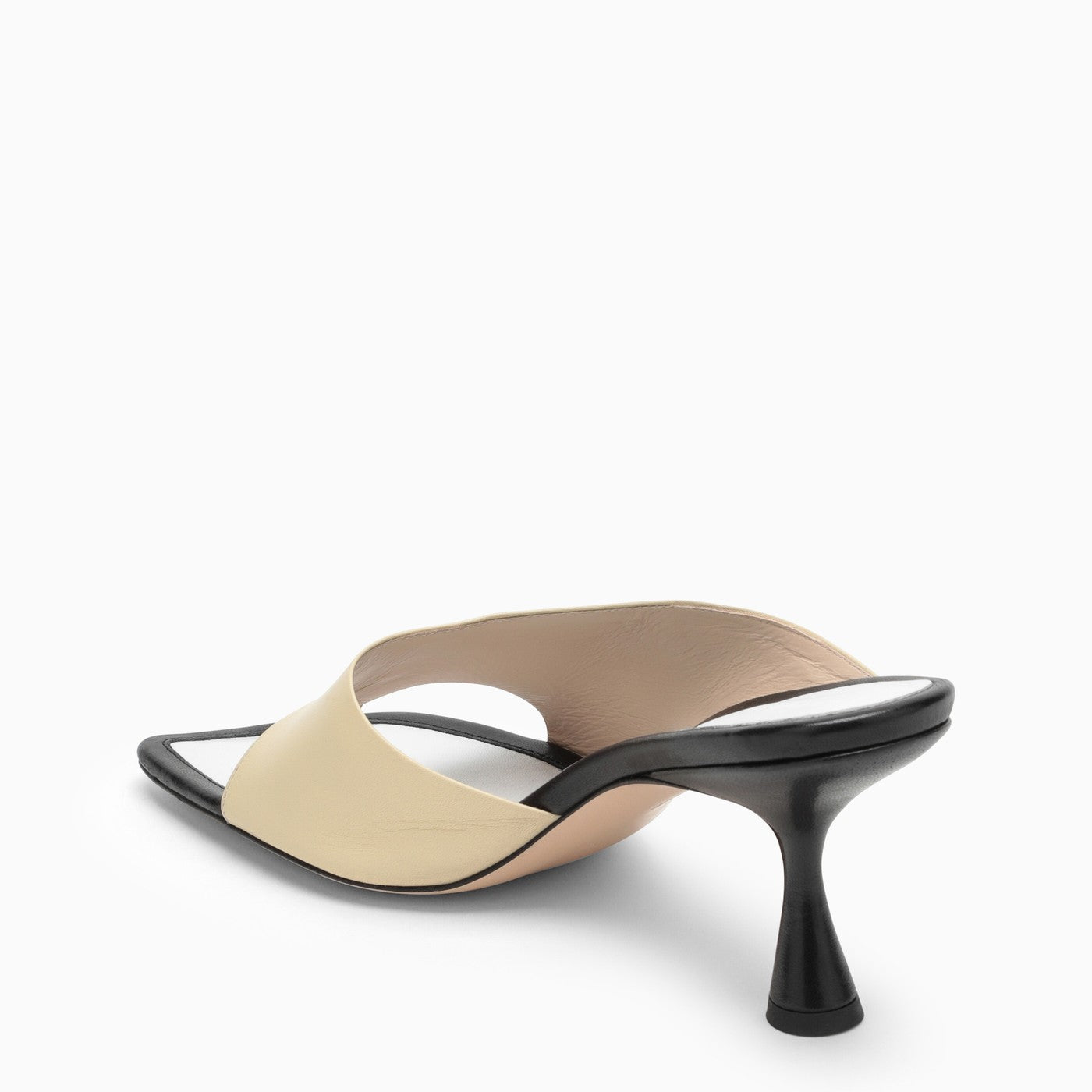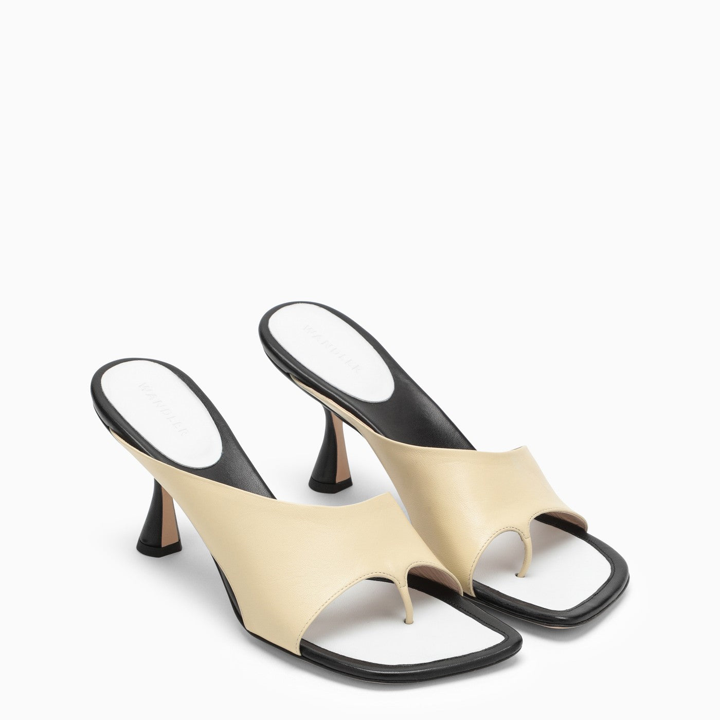Ivory and black smooth leather sandal by Wandler featuring flip-flop detail, spool heel, square toe and leather sole.