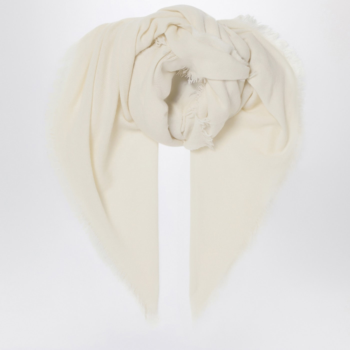 White milk cashmere scarf by Destin Surl with frayed edges.