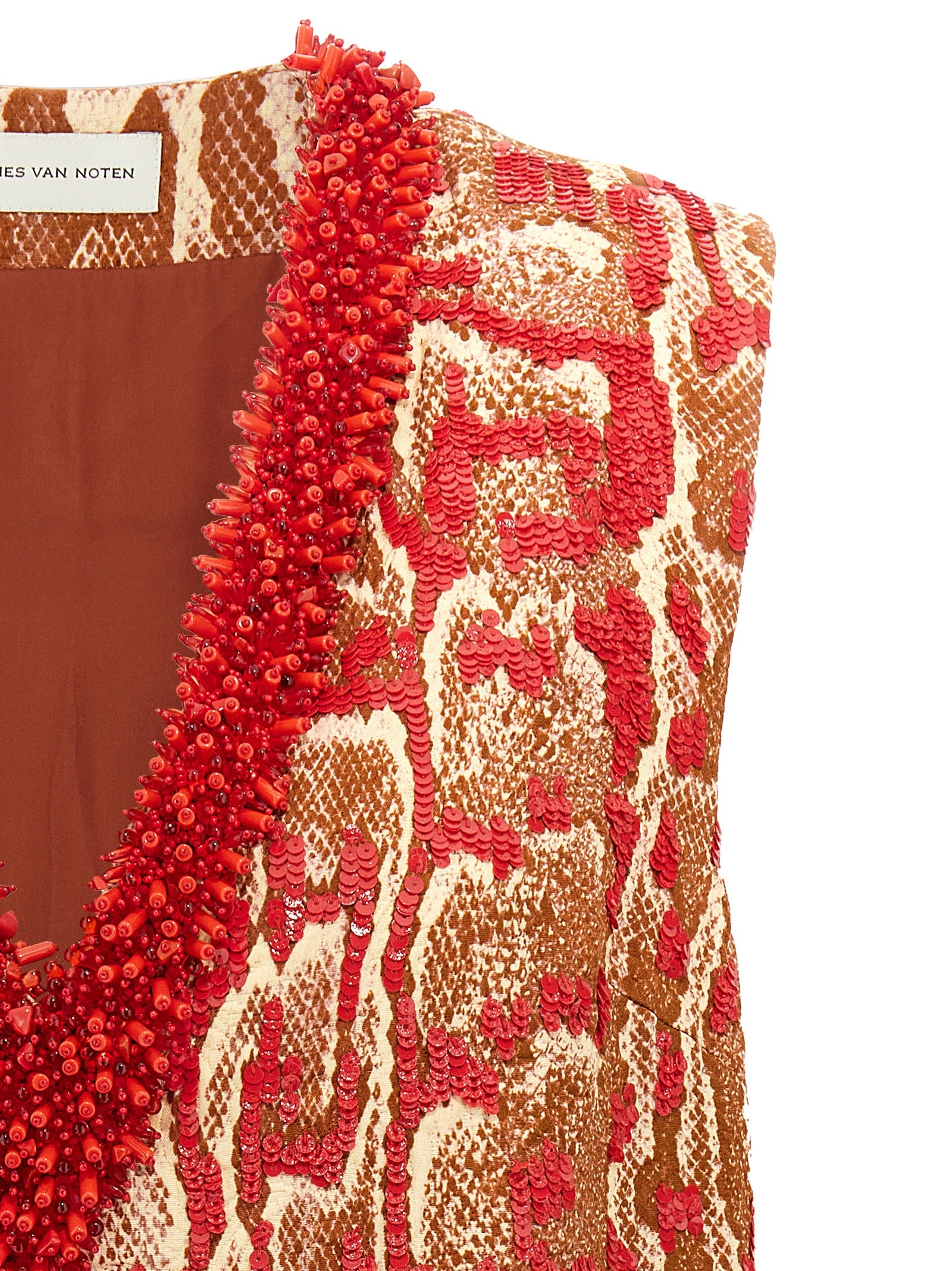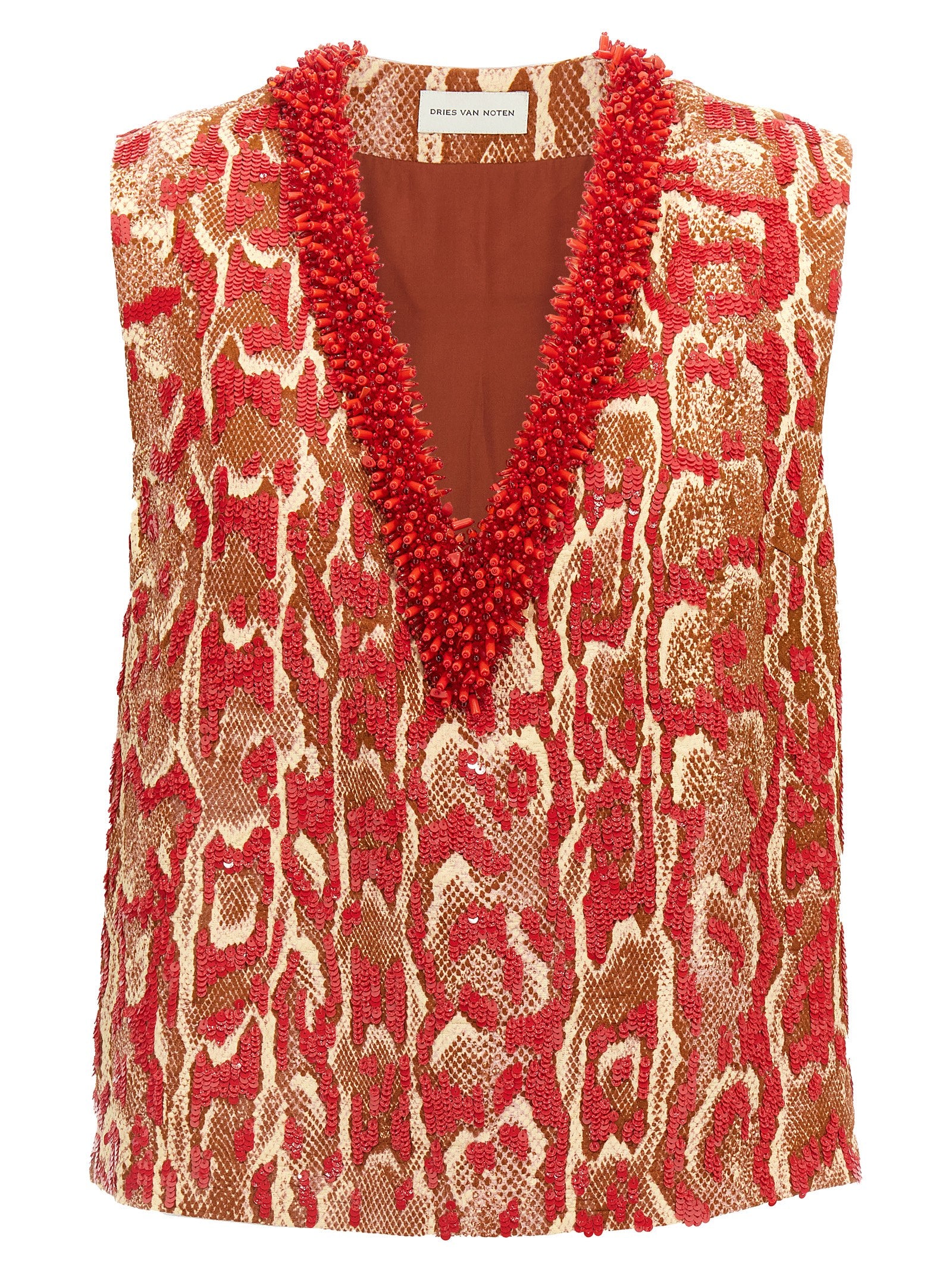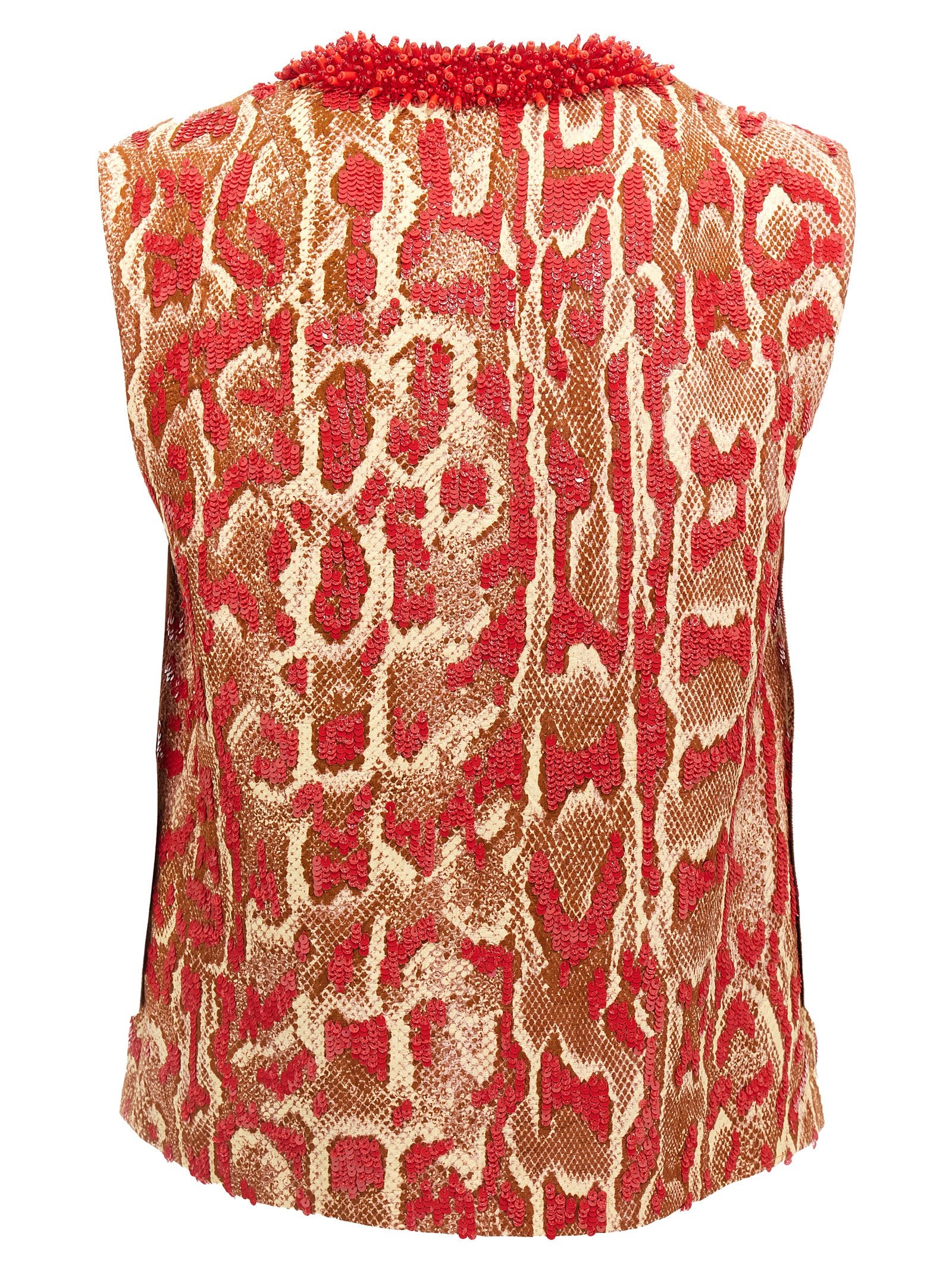 'College' shirt in cotton and viscose blend snake print with all-over sequin application, lining, V-neck with beads application, sleeveless.