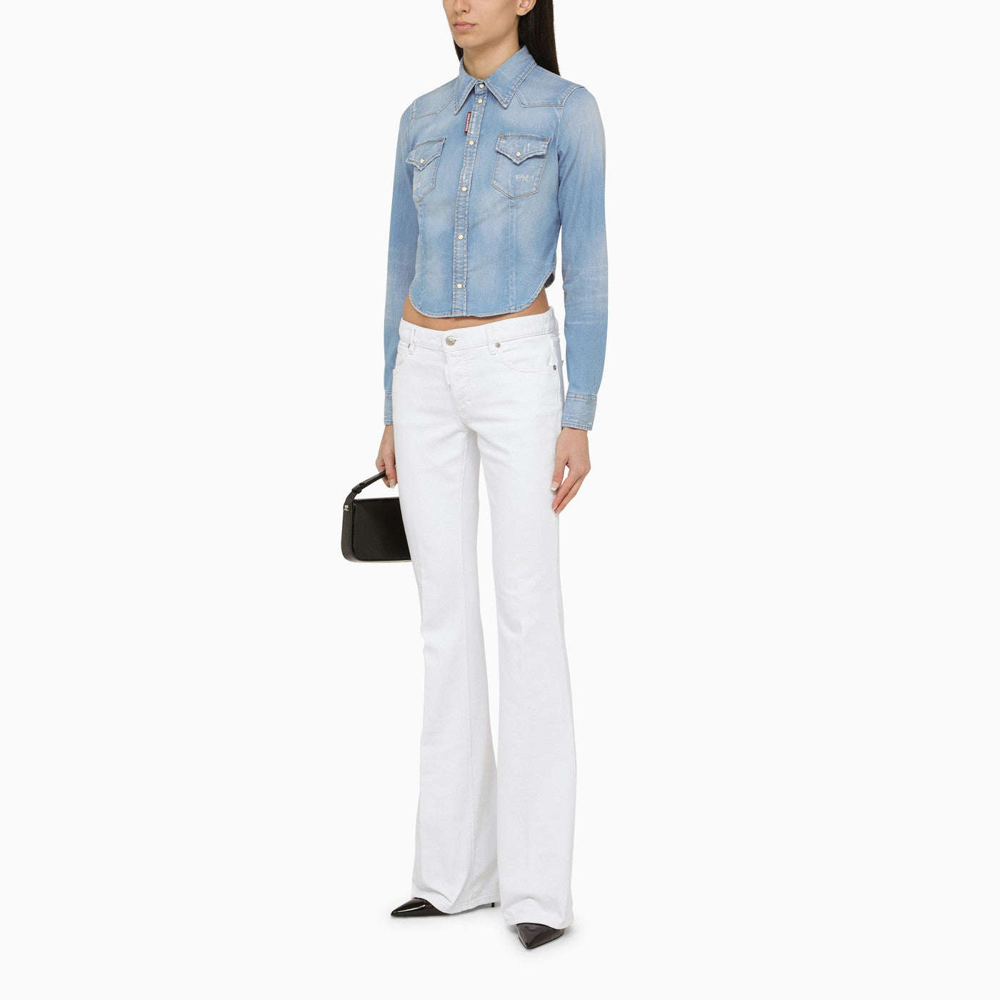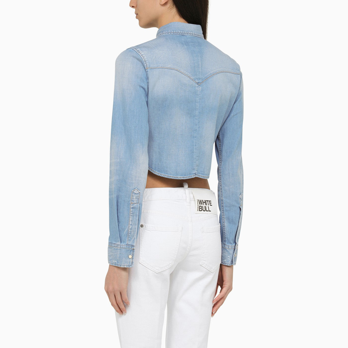 Light blue cotton denim cropped shirt from Dsquared2 featuring a classic pointed collar, long sleeves, a front button placket, two chest pockets, a stitched logo to the front and an asymmetric hem.