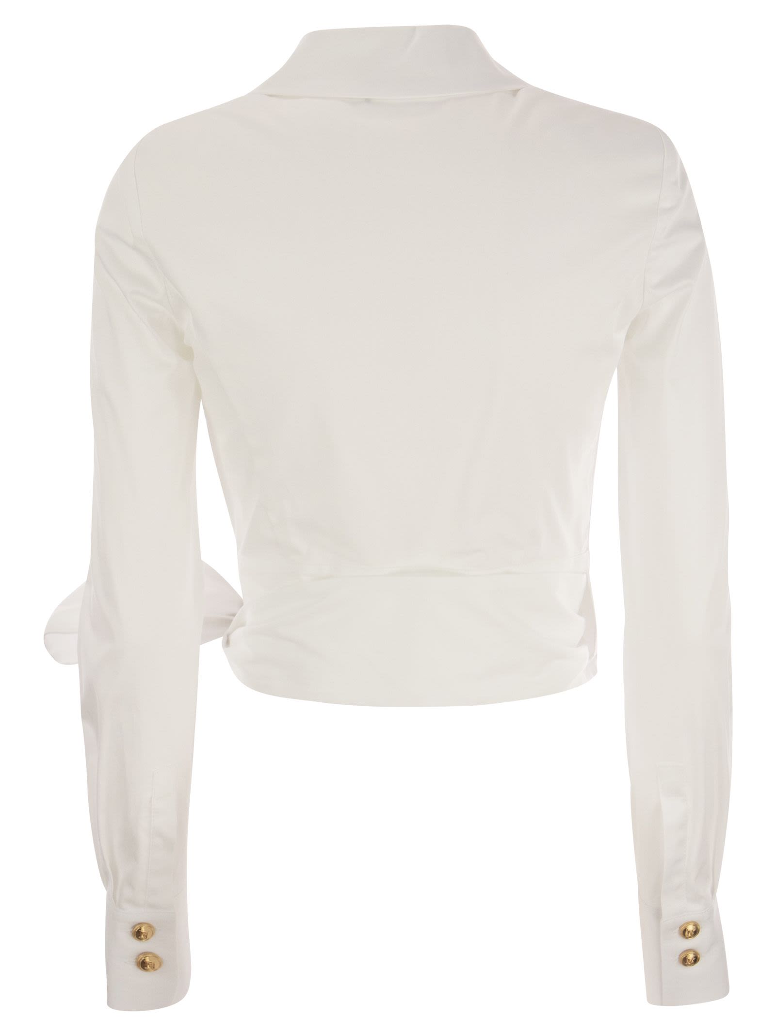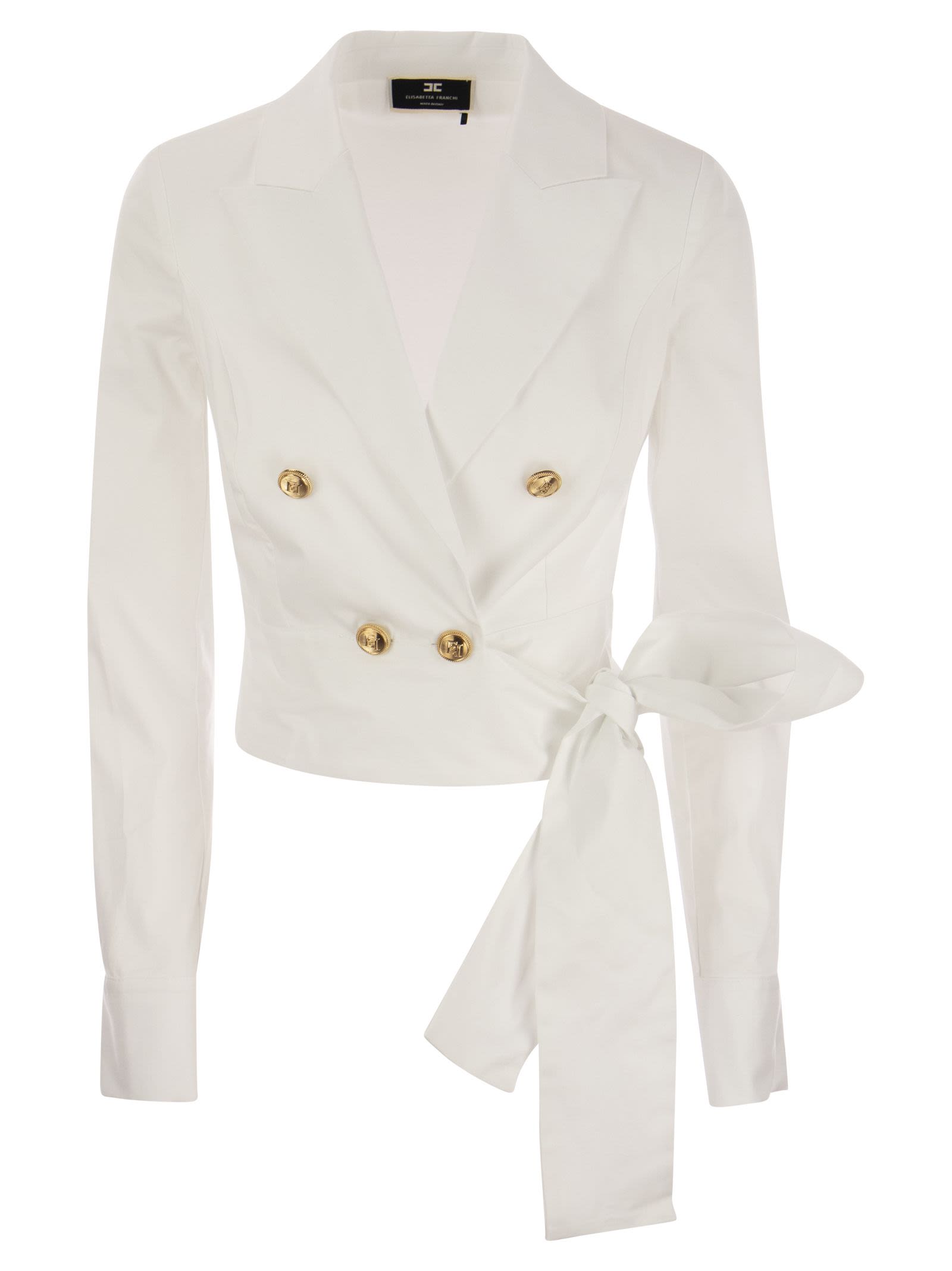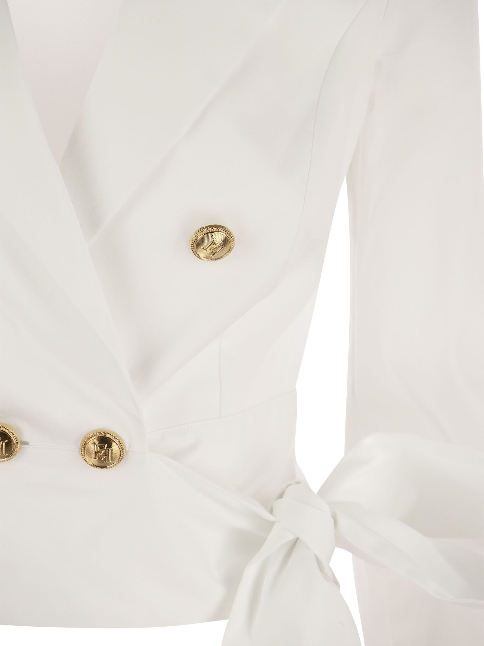 Cotton poplin shirt with peaked lapels, double-breasted placket and sash at hem. - Padded shoulder strap - Gold metal buttons DESIGNER ID: CA01836E2 100
