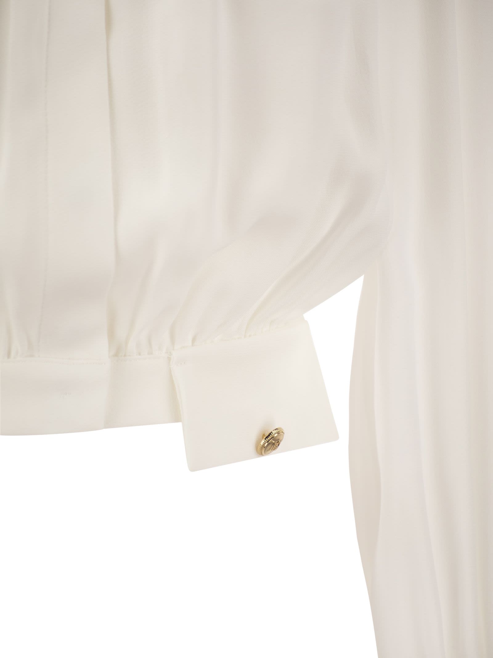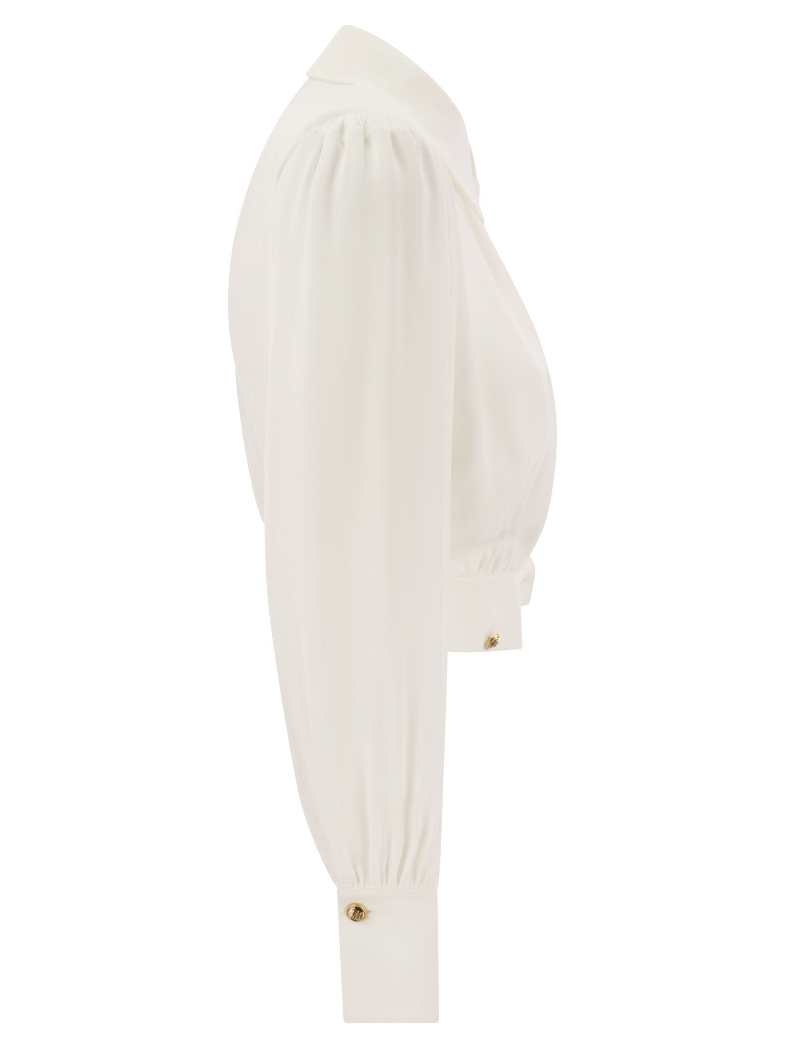 Long-sleeved cropped shirt in viscose georgette with gathered neckline and sleeves. The waistline is emphasized by a band with flaps and golden metal buttons. - Golden metal buttons - Slim fit DESIGNER ID: CAT2541E2 360