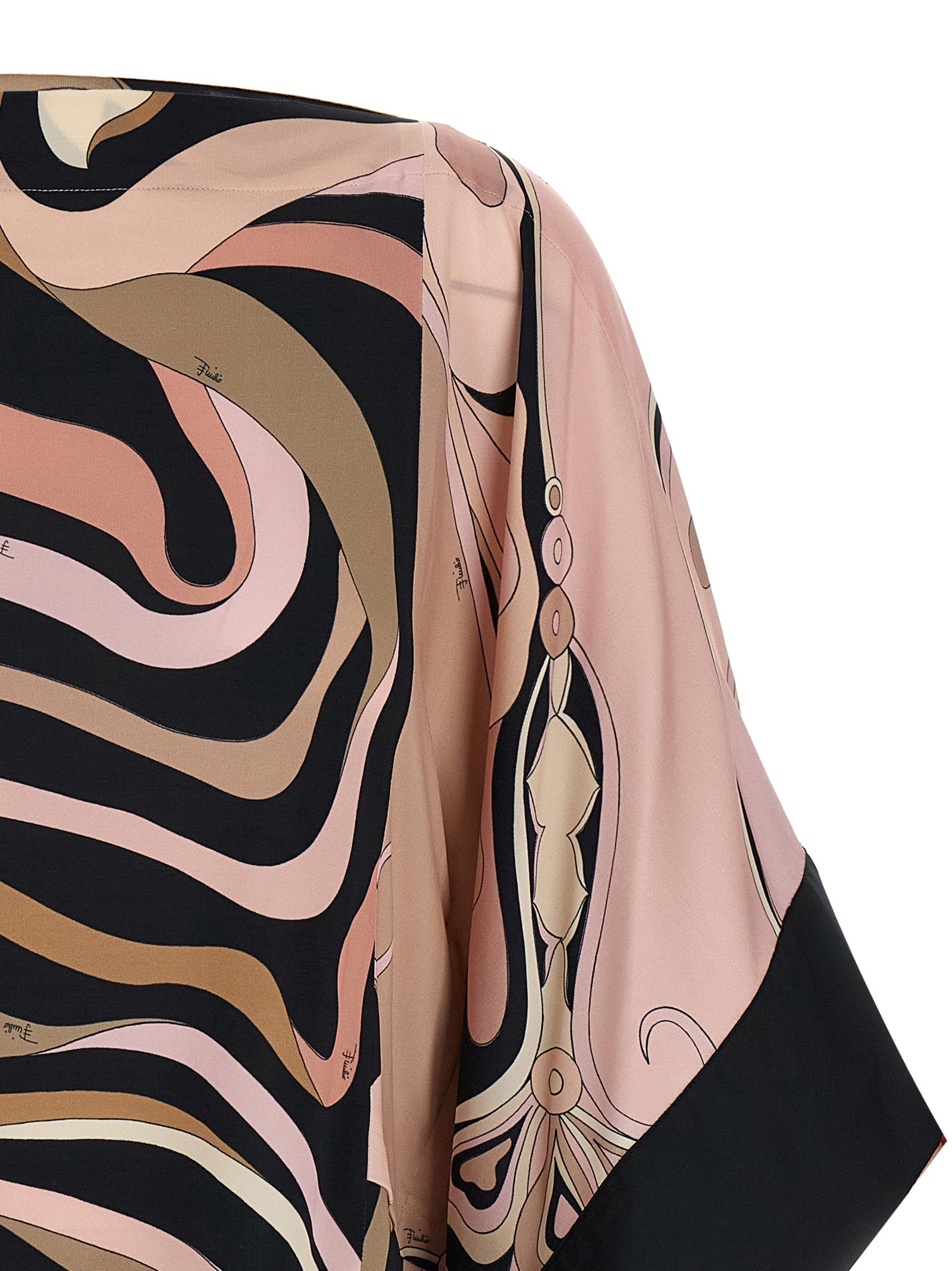 Stretch viscose blouse with wave print, Boat neck, short bat sleeves with solid color piping. This product, like many other Pucci items, is made with an all-over print that falls differently on each garment; The product shipped may differ from the one in the picture.
