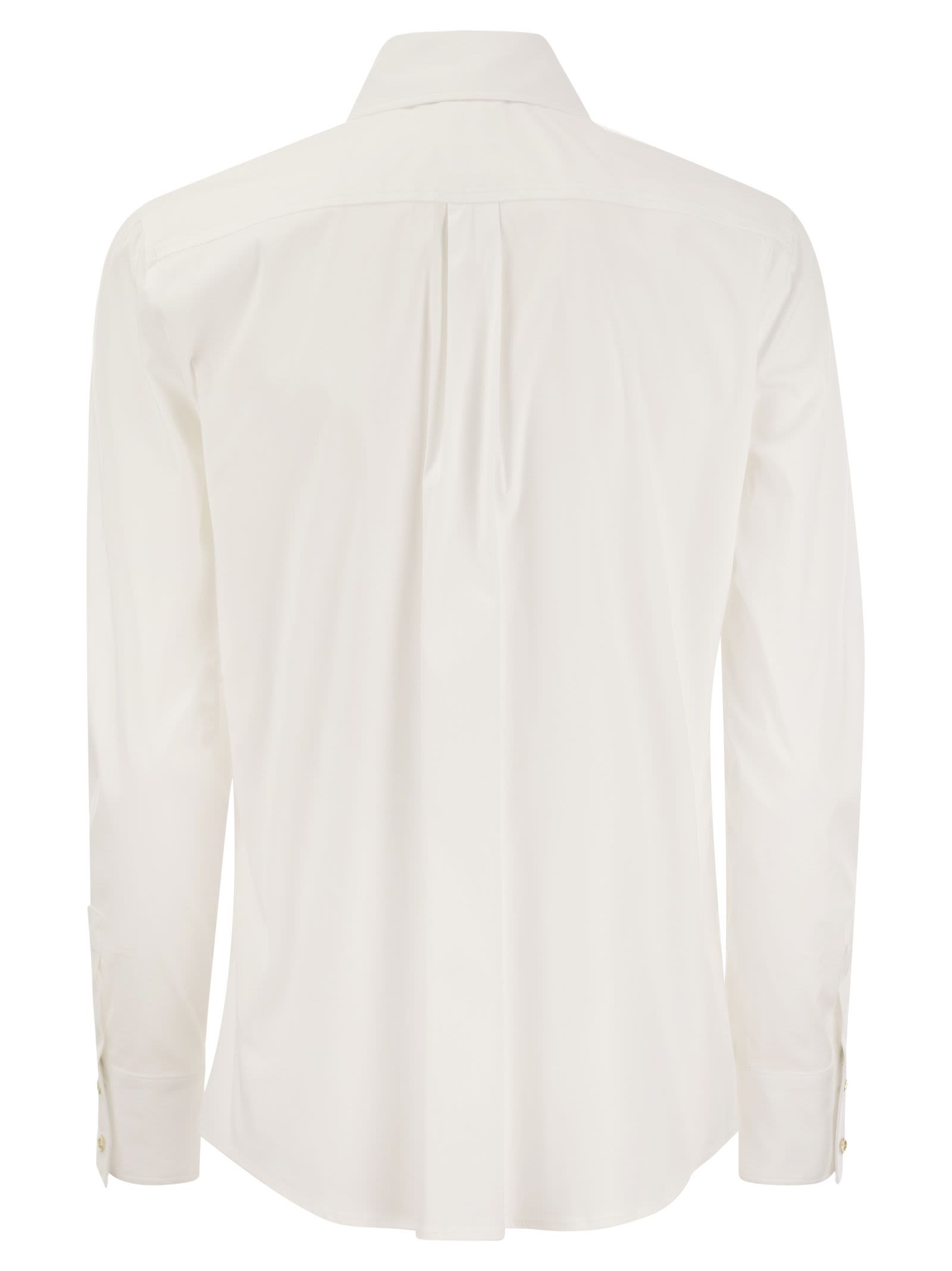 Masculine cut shirt made of pure stretch cotton, with pointed collar and long sleeves. With asymmetrical rounded hem and embroidered logo on the side. - Long sleeves - Regular fit DESIGNER ID: 2416111021600 001