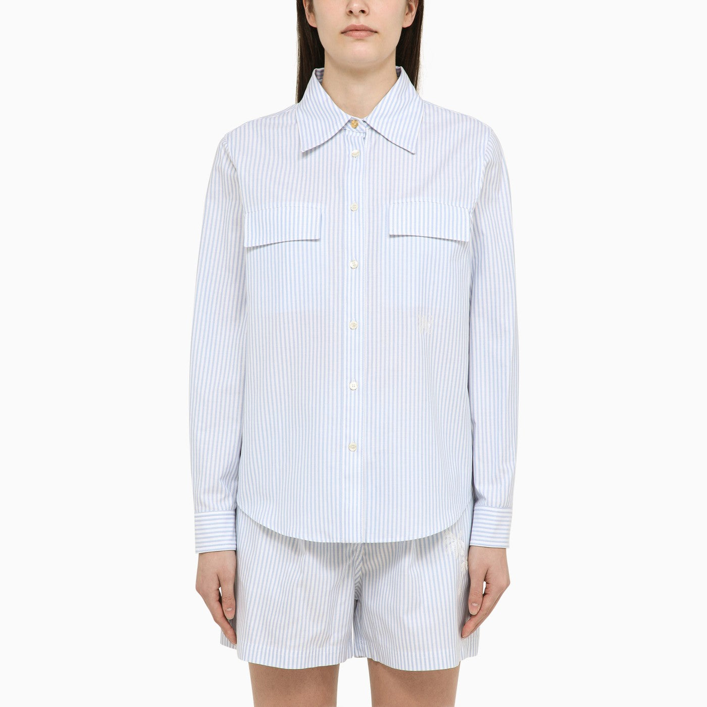 White and light blue striped cotton shirt from Palm Angels featuring a pointed collar, long buttoned sleeves, a concealed front button fastening, a back vent, two front flap pockets and an embroidered logo on the front.