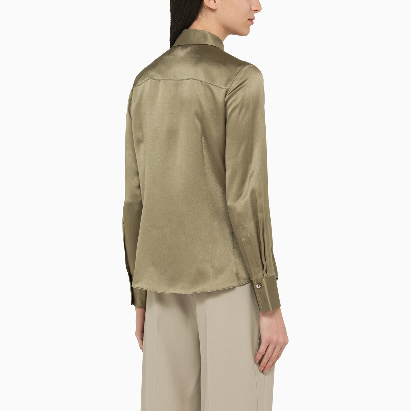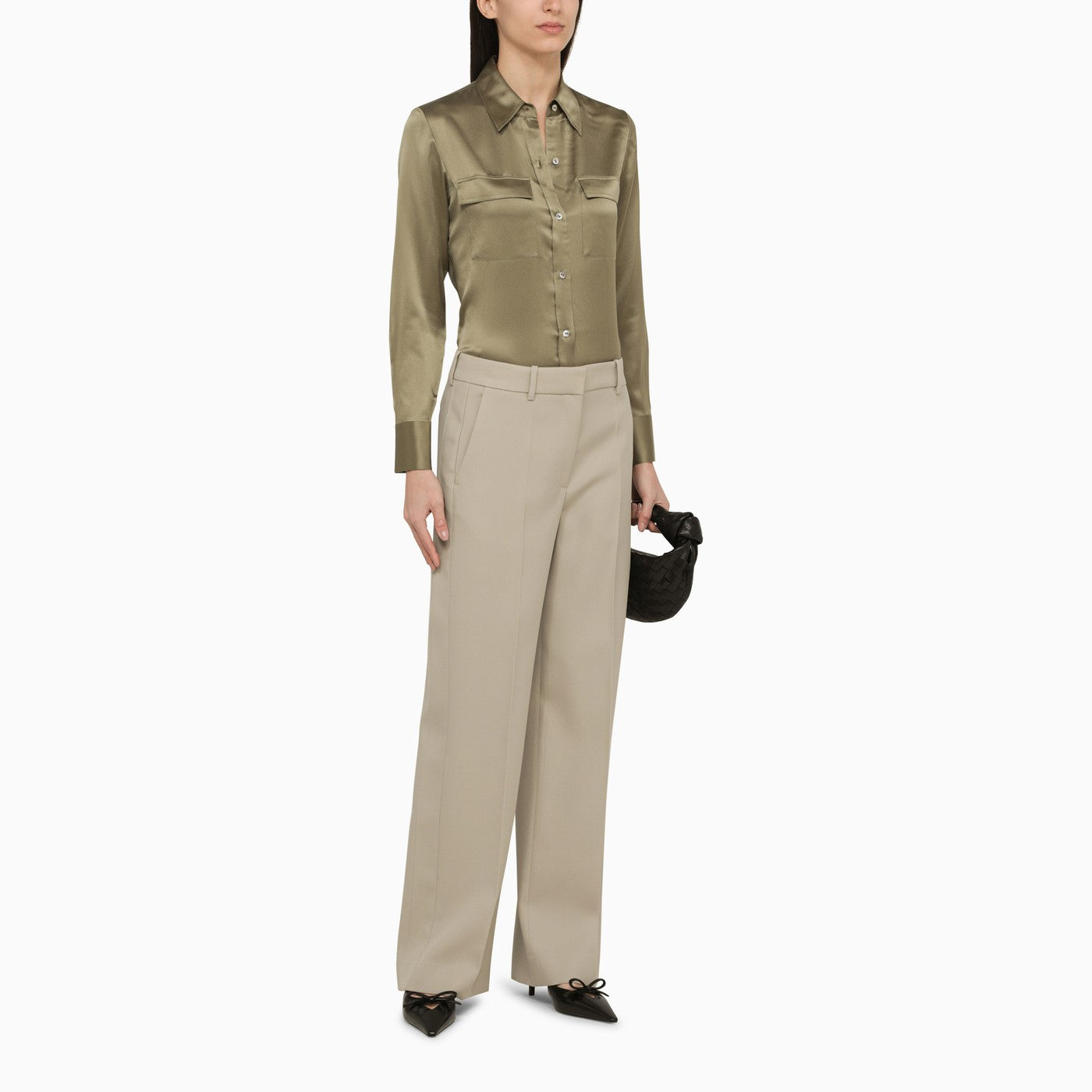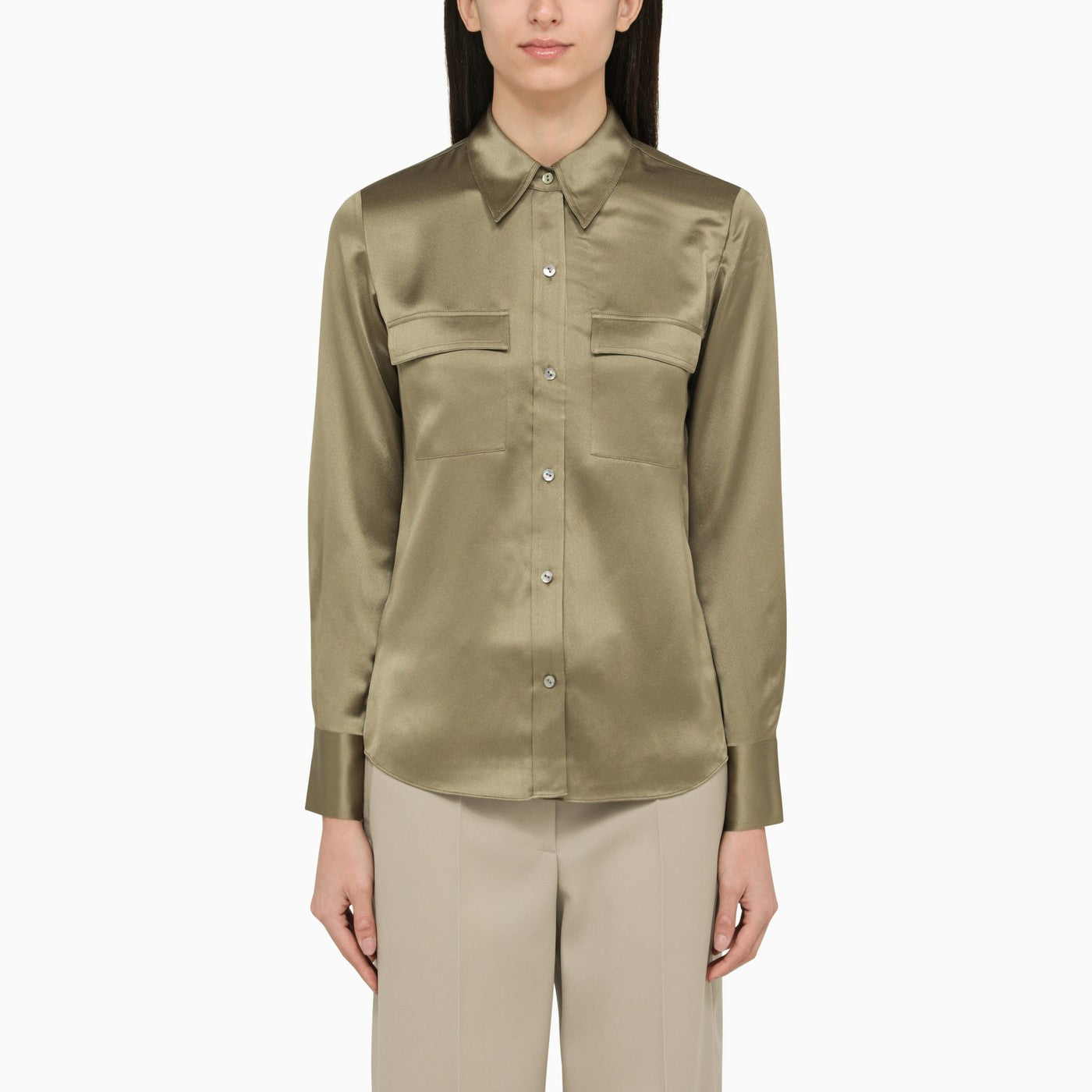 Artichoke green silk regular shirt from Vince featuring long sleeves, a front button placket and two patch pockets with flaps on the front.