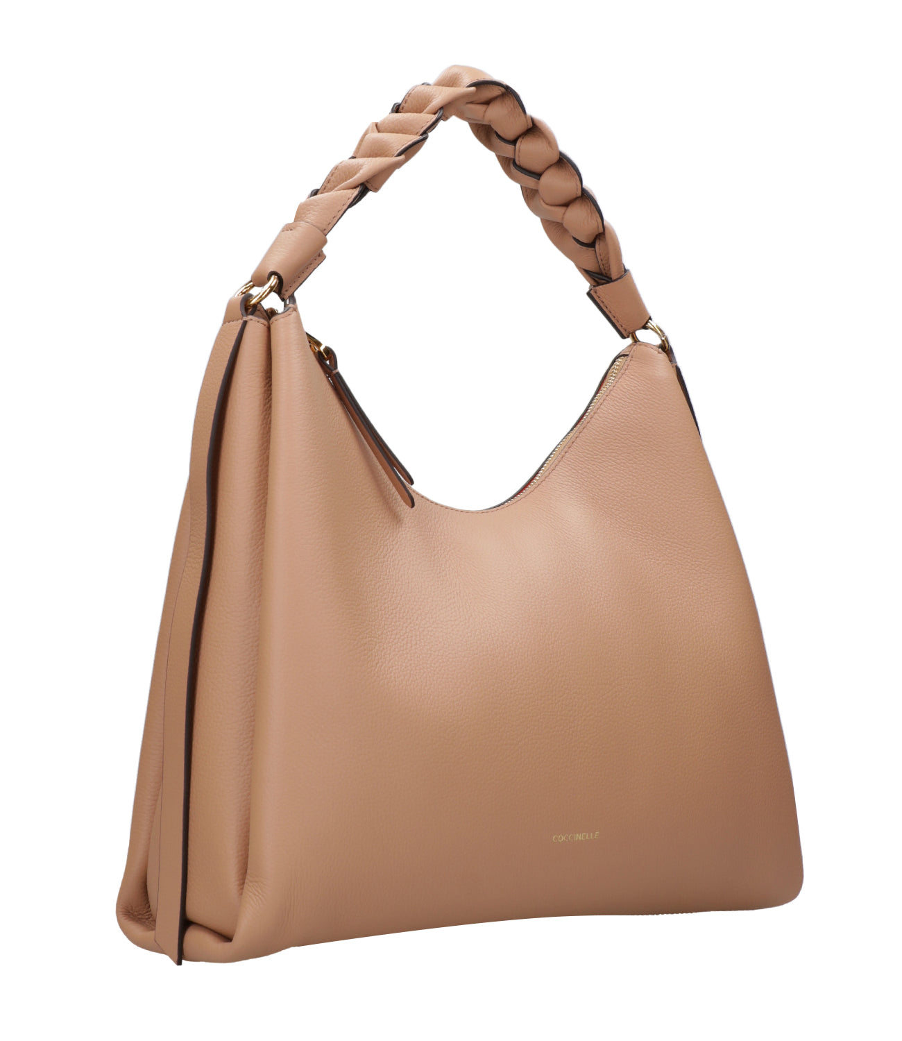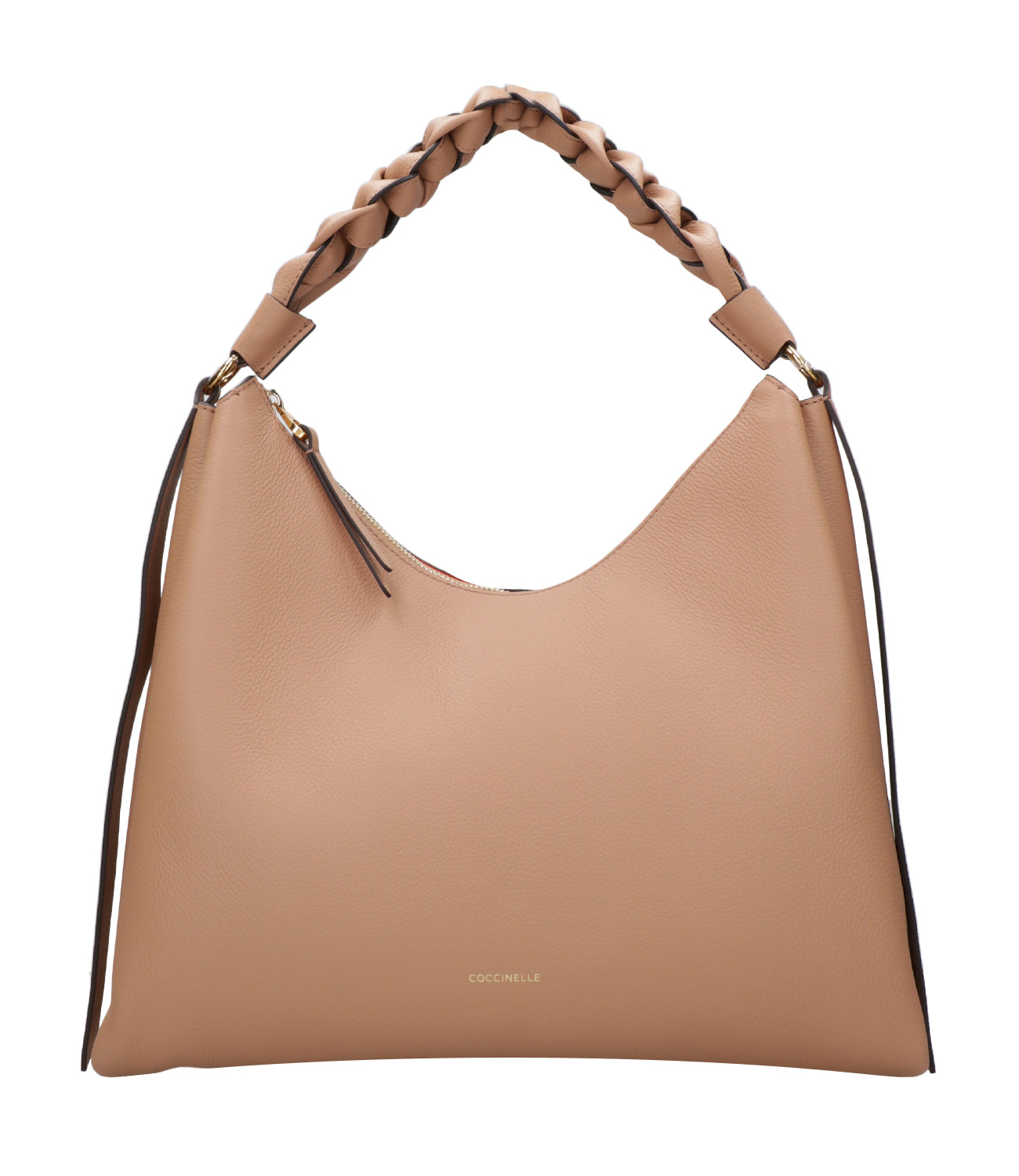 - Leather - Medium shoulder model - Fixed woven leather handle - Top zipper and pull leather closure - Three inside pockets, one zippered - Galvanic gold details - Gold stamp logo - Dimensions: W 34cm H 23cm D 11cm - Weight 900g