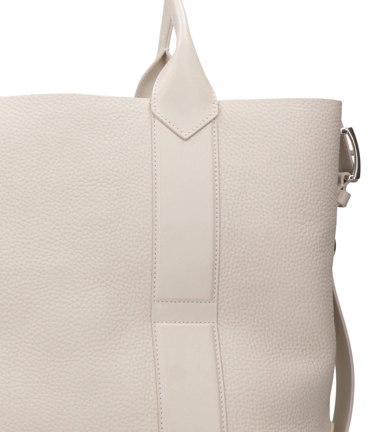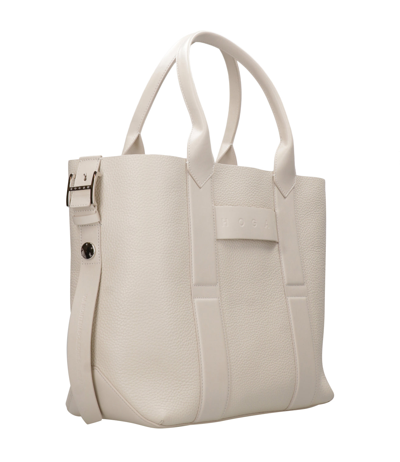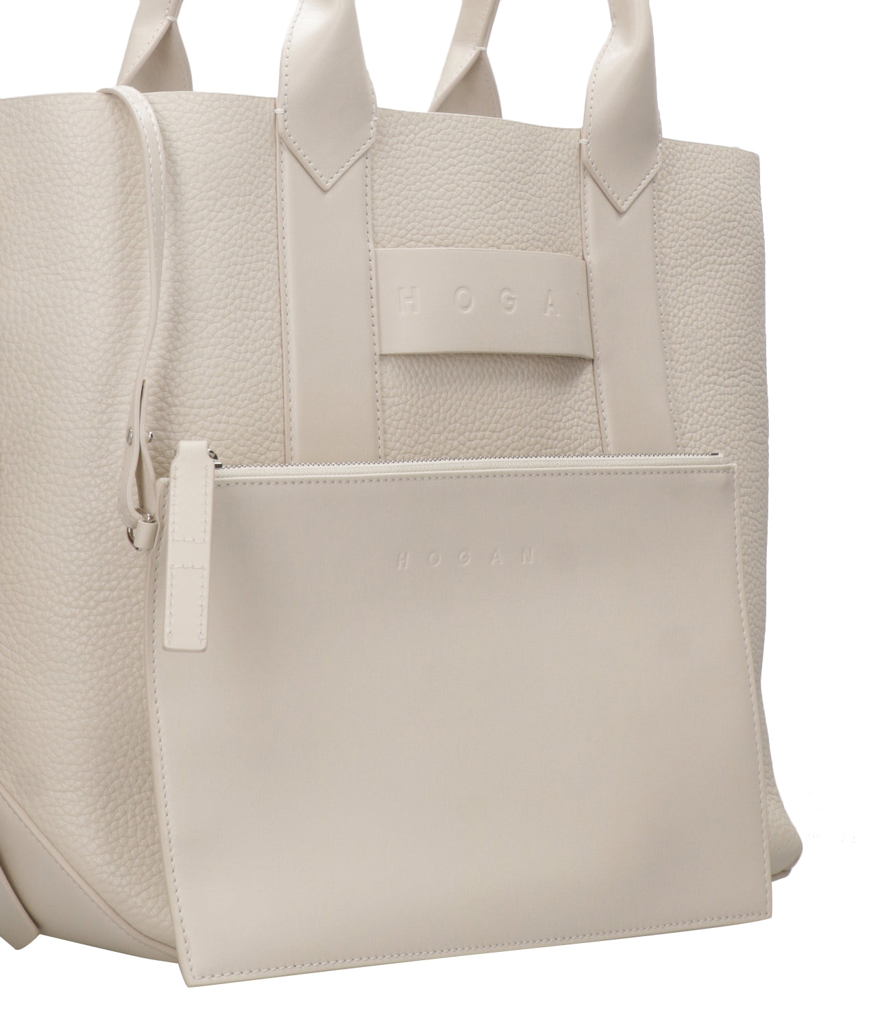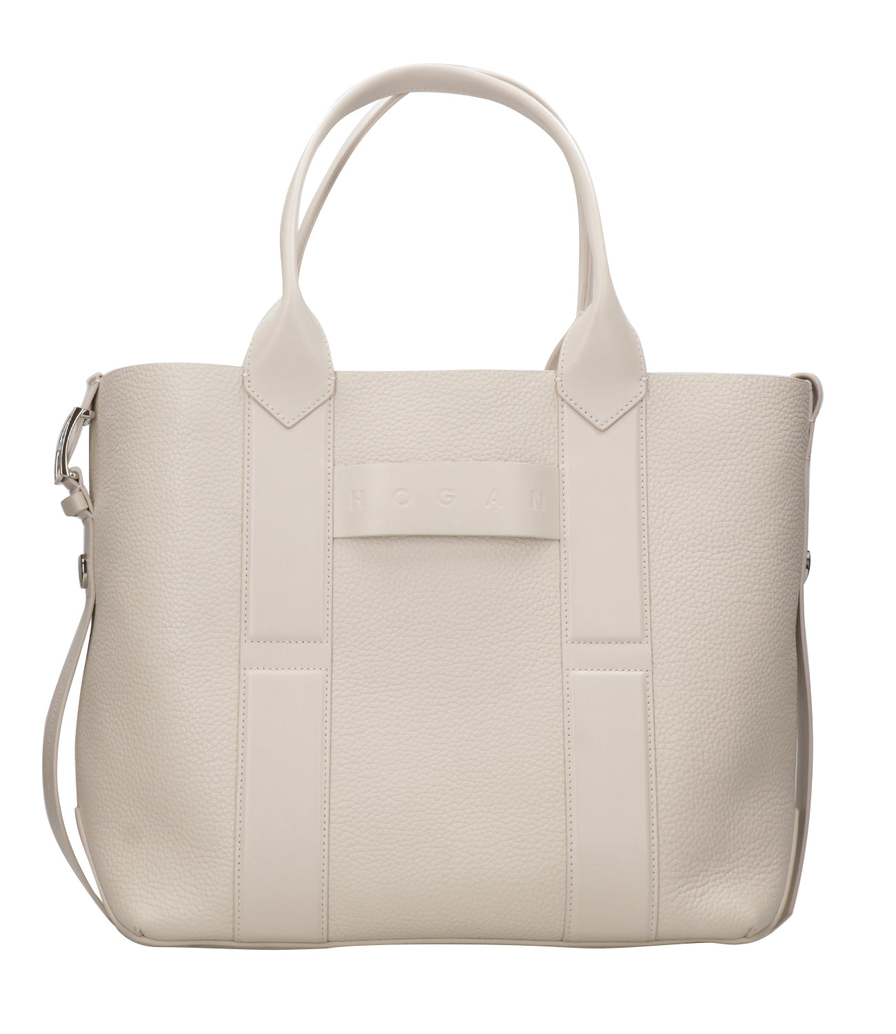 - Grained leather - Smooth leather inserts - Front handle with embossed Hogan logo - Fixed handles - Adjustable top compartment with personalized strap and buckle - Via Monte Napoleone address logo imprinted on left list - Hogan logo imprinted on the right list - Interior matching leather pouch and removable zipper - Metal feet - Fabric pouch included - Dimensions: H 40cm; W 32cm; D 16cm