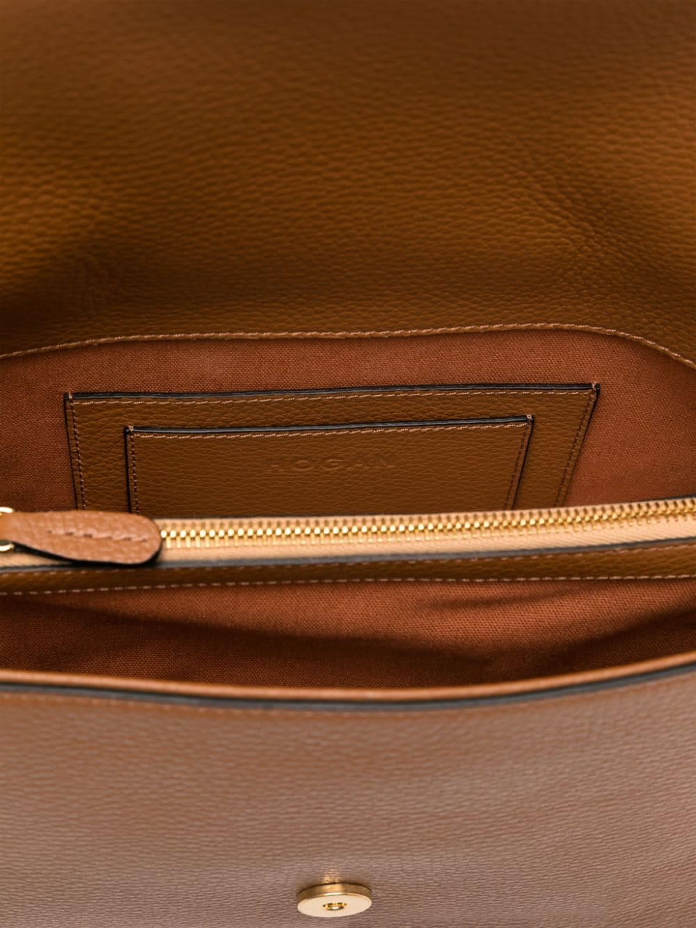 camel brown calf leather pebbled texture embossed logo to the front foldover top sliding shoulder strap partitioned compartment internal zip-fastening pocket internal patch pocket internal card slot debossed internal logo full lining concealed magnetic fastening This piece comes complete with a protective dust bag.