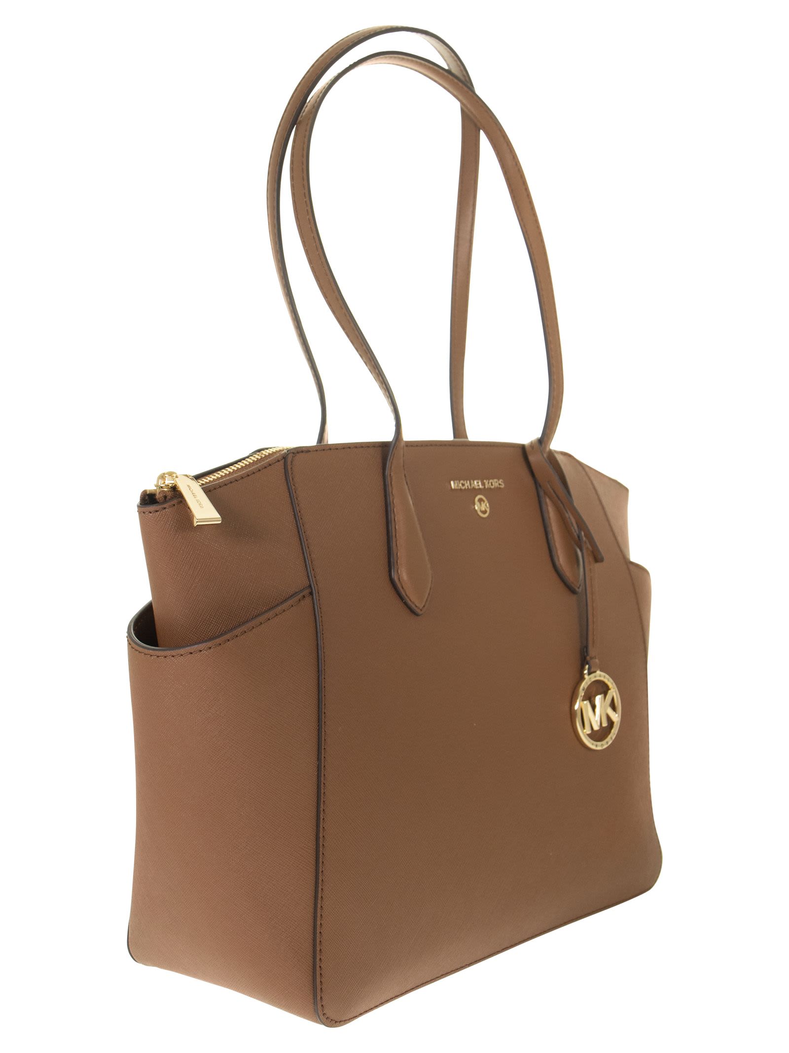 The Marilyn tote bag is an everyday essential. The iconic "MK" initials lend an unmistakable charm to this Saffiano leather model with a structured design, while the spacious interior features special pockets for everyday items. Slim handles make it ideal for comfortable shoulder wear on busy days. - Gold-tone metal details - External details: 2 side slip pockets - Interior details: back zip pocket, 2 front slip pockets - Zip closure DESIGNER ID: 30S2G6AT2L 230