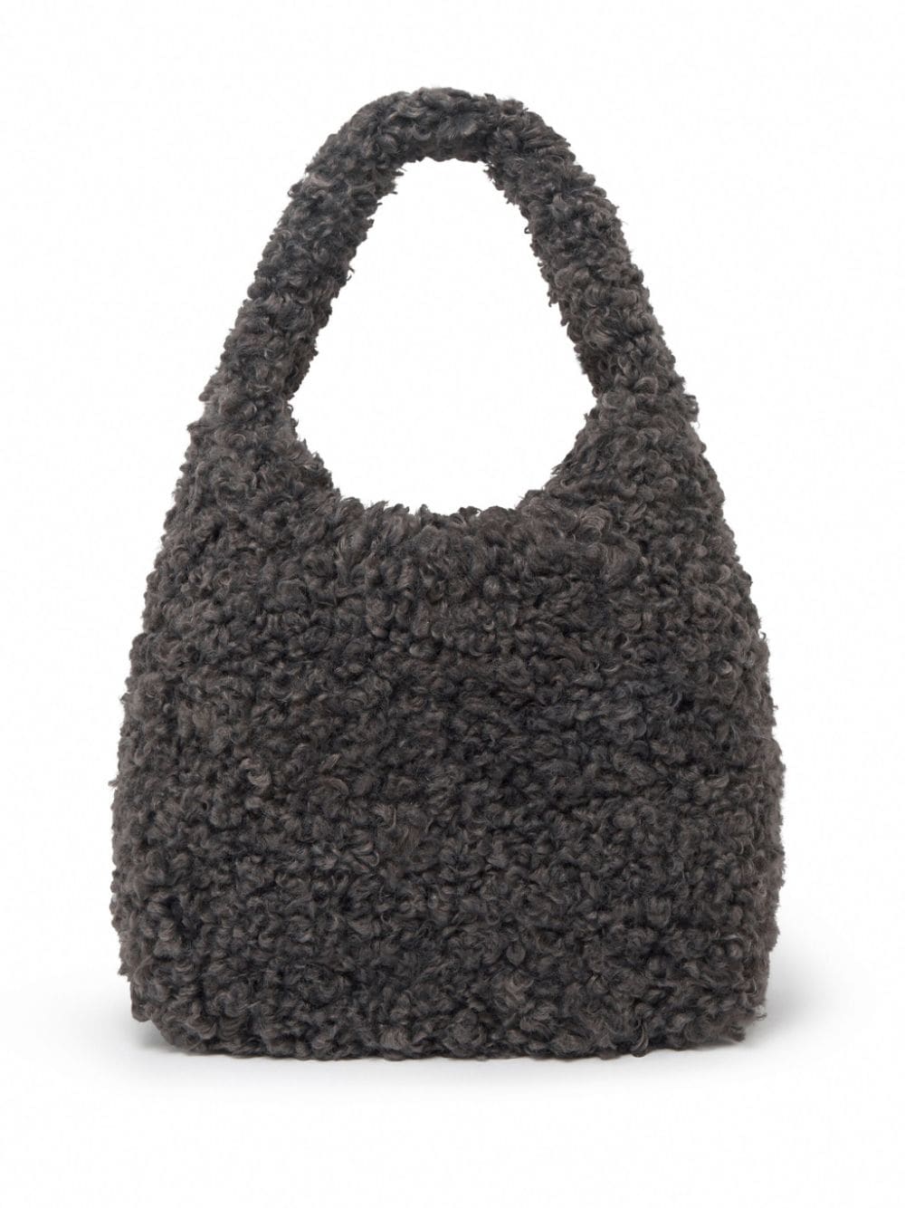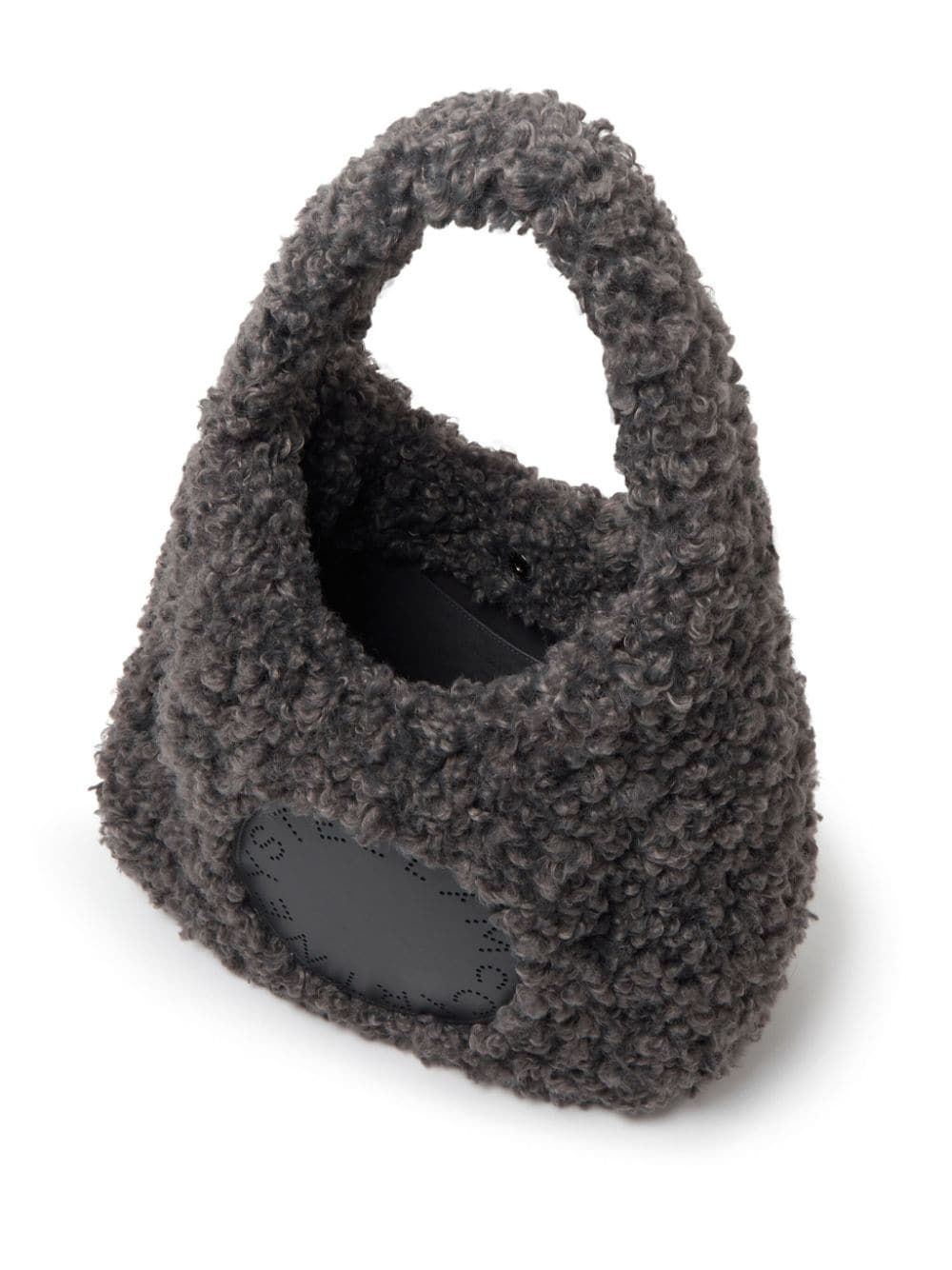 charcoal grey faux-fur design magnetic fastening single top handle appliqué logo perforated logo detail contrast stitching main compartment full lining removable pouch