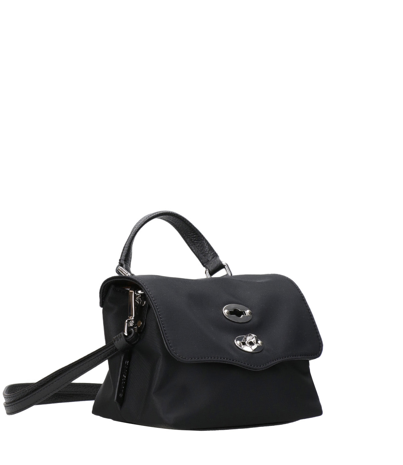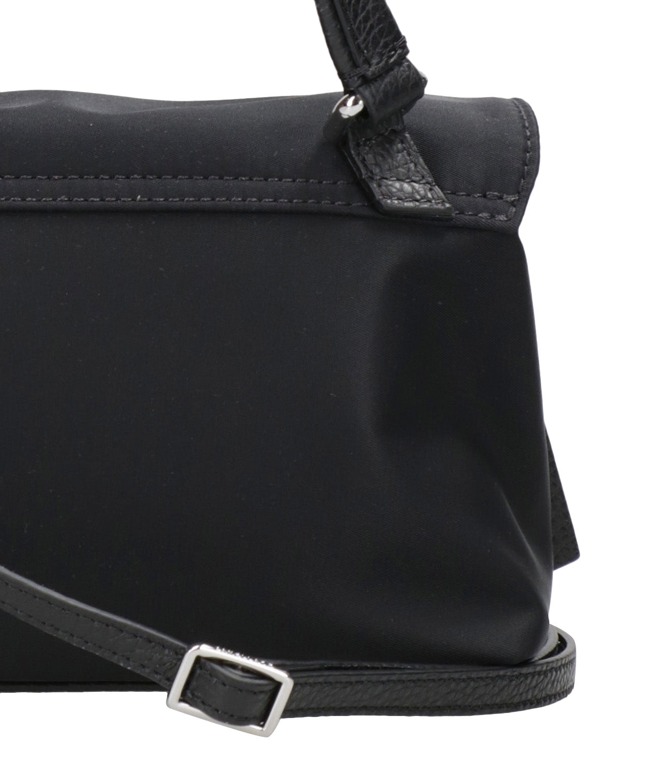 - Technical fabric - Calfskin leather trim - Fixed leather handle - Adjustable and removable leather shoulder strap - Silver metal spool and double-slit closure - Front flap - Open interior pocket - Lined - Dimensions: L 19cm x H 12cm x D 11cm - Made in Italy