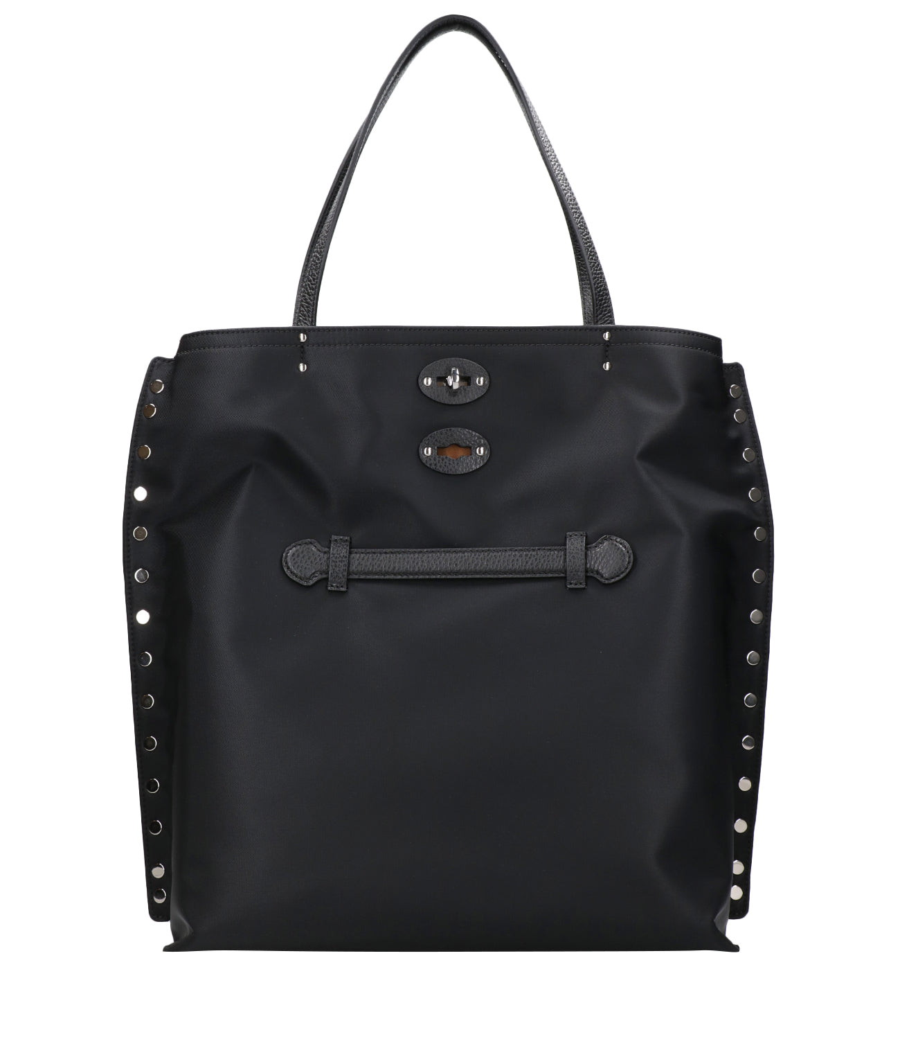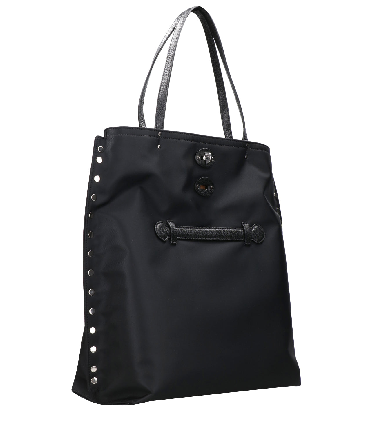 - Smooth technical fabric - Double design shoulder or fold-over model - Closure with double metal twist-lock buckle - Leather handles on top - Front loop that converts to a handle for small size wear - Metal side studs - Inside zipper pocket - Unique code inside to ensure uniqueness - Dimensions: W 15 cm H 33 cm D 5 cm - Made in Italy