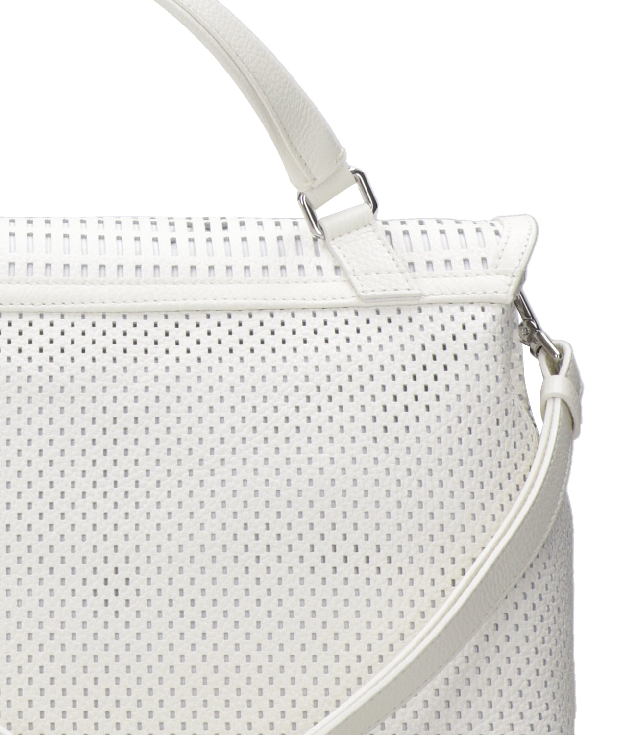- Hammered leather - Studded detail on the sides - Metal flap and double spool closure - Adjustable and removable leather shoulder strap - 7cm leather handle - Inside slit pocket - Inside pocket with metal zipper - Two interior compartments - Dimensions: W 35cm H 24cm D 17cm - Made in Italy