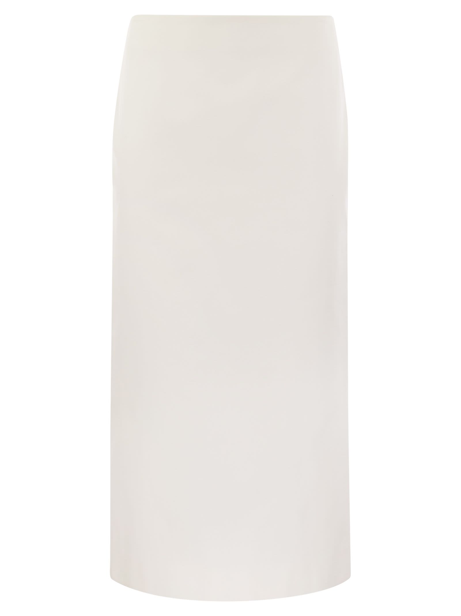 Low-waisted longuette skirt, made of pure cotton fabric. The design is essential, laid on the hips and completed by darts and a concealed back zip. At the back there is an open slit with a diagonal line, which starts overlapping and becomes receding at the bottom. - Ankle length - Back zip fastening - Back slit DESIGNER ID: 2412101223600 001