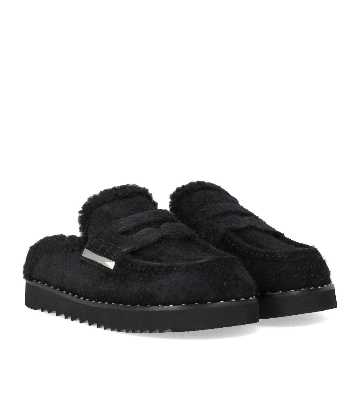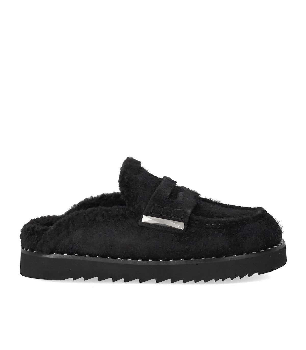 Ash black suede clog featuring a teddy-effect eco-fur lining. Black rubber sole outlined with small silver metal studs, height 2.5 cm.