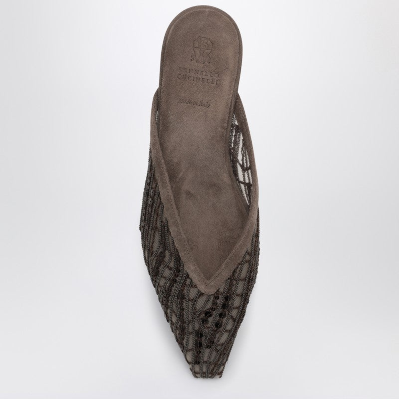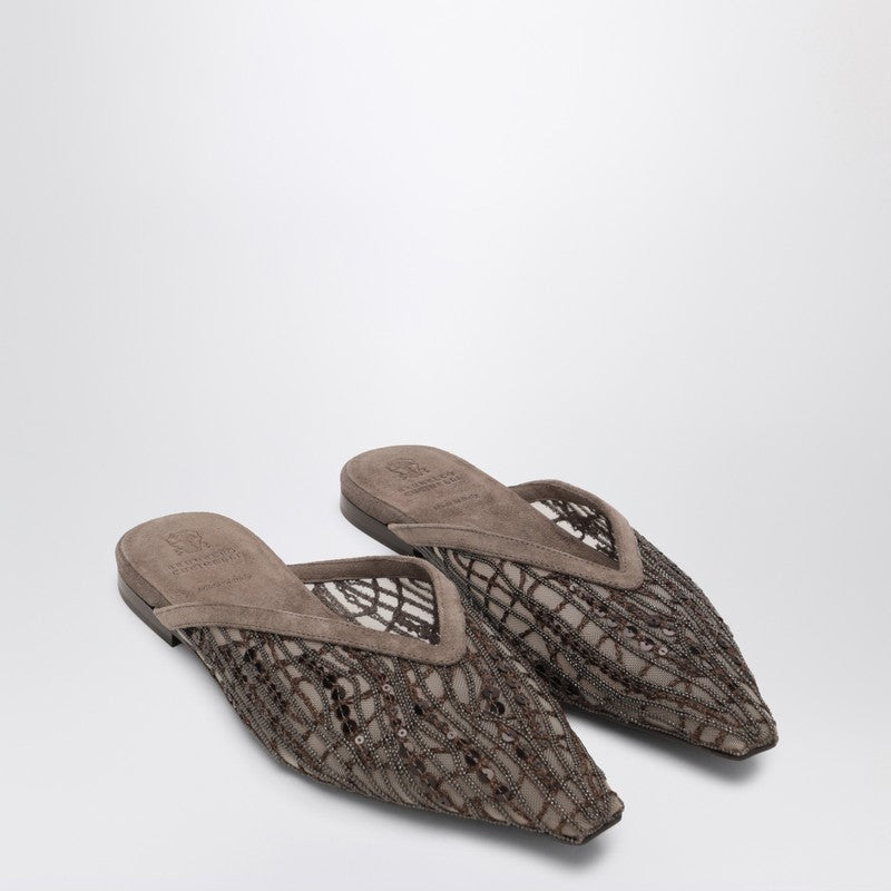Brunello Cucinelli clogs with netting work with sequins, characterized by a suede lining, non-slip rubber inserts, square toe, and leather sole.