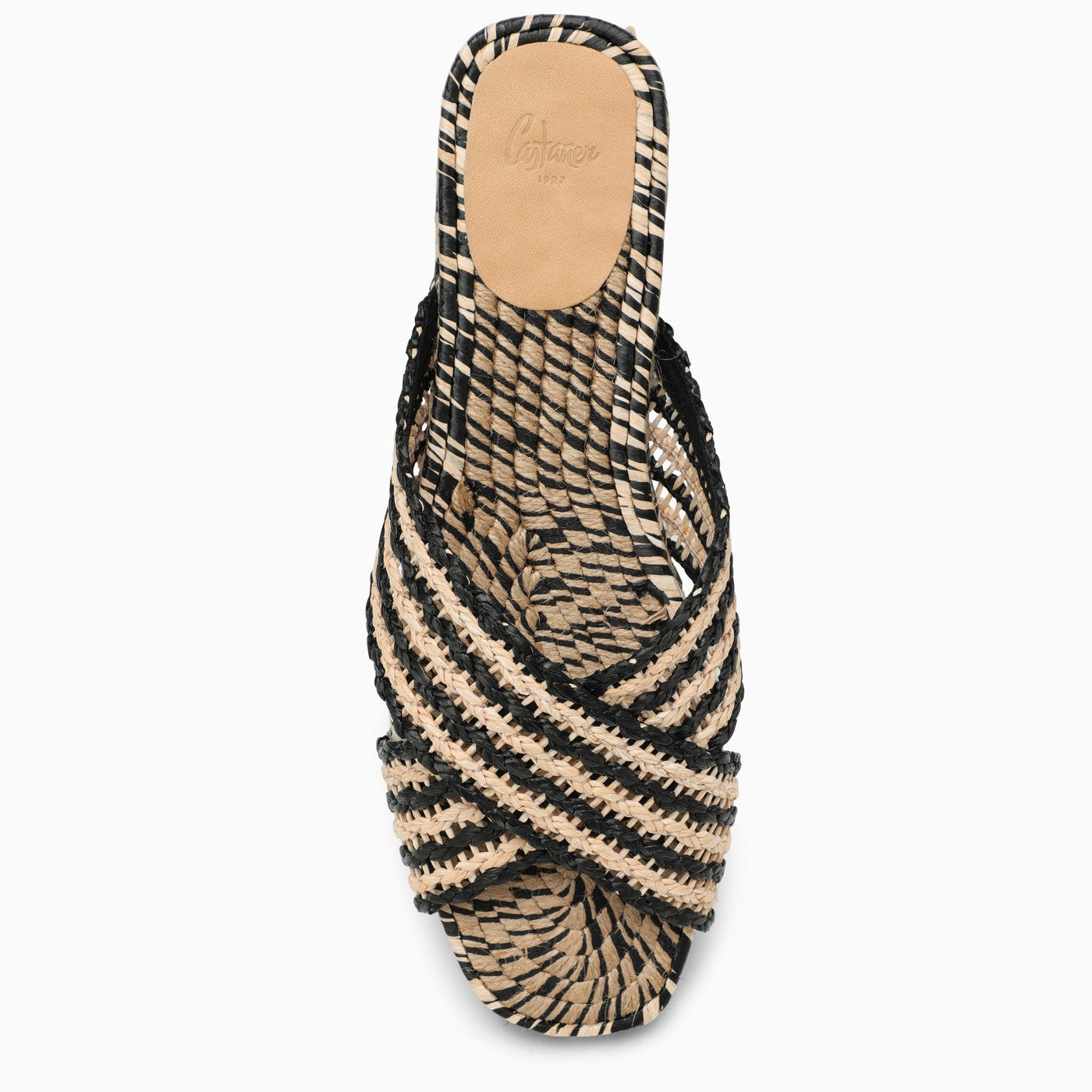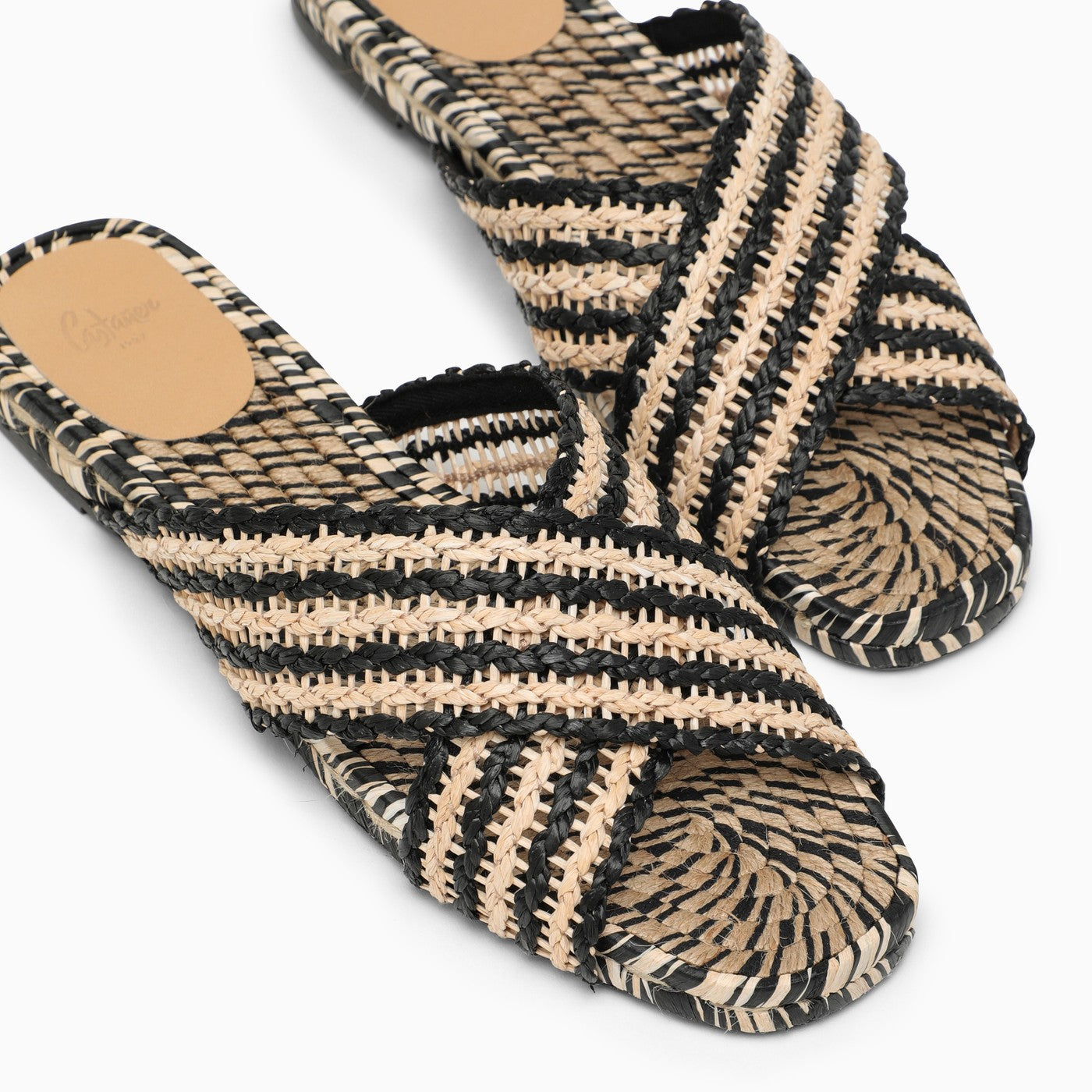 Slipper by Castañer made from black and natural multicoloured cotton upper, featuring criss-crossed straps, a logo-printed insole, an open toe and a rubber sole.
