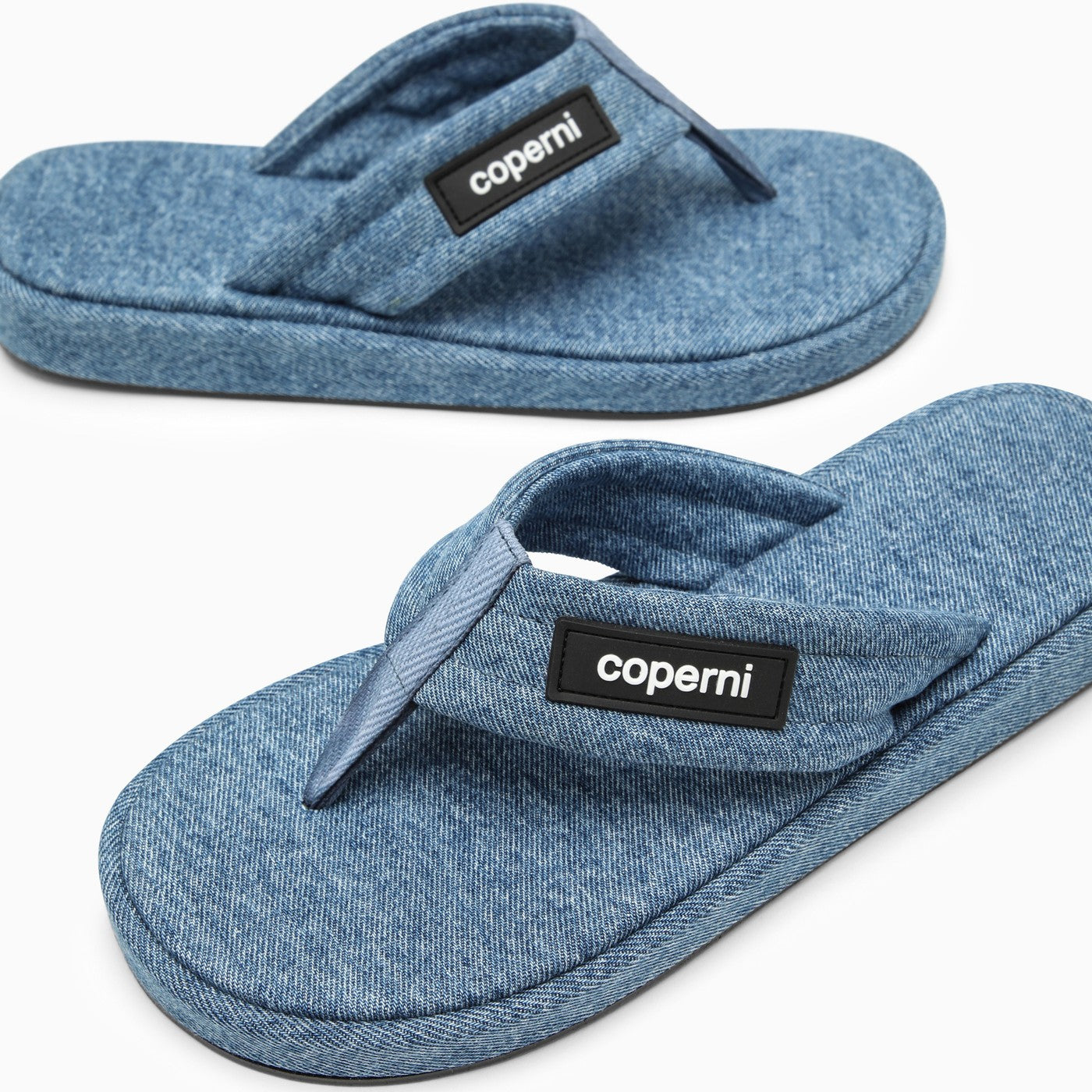 Blue denim flip-flop by Coperni, featuring a contrasting logo plaque and rubber sole.