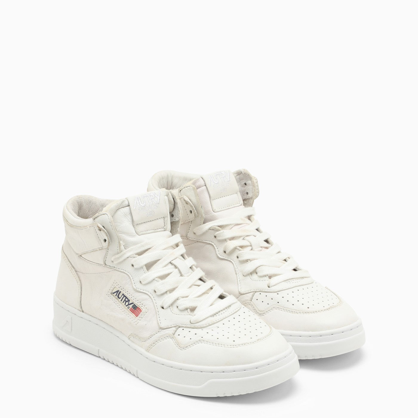 Medalist Mid sneaker by Autry in white leather, featuring perforated rounded toe, lace closure, logo patch on the tab and on the side and rubber sole.